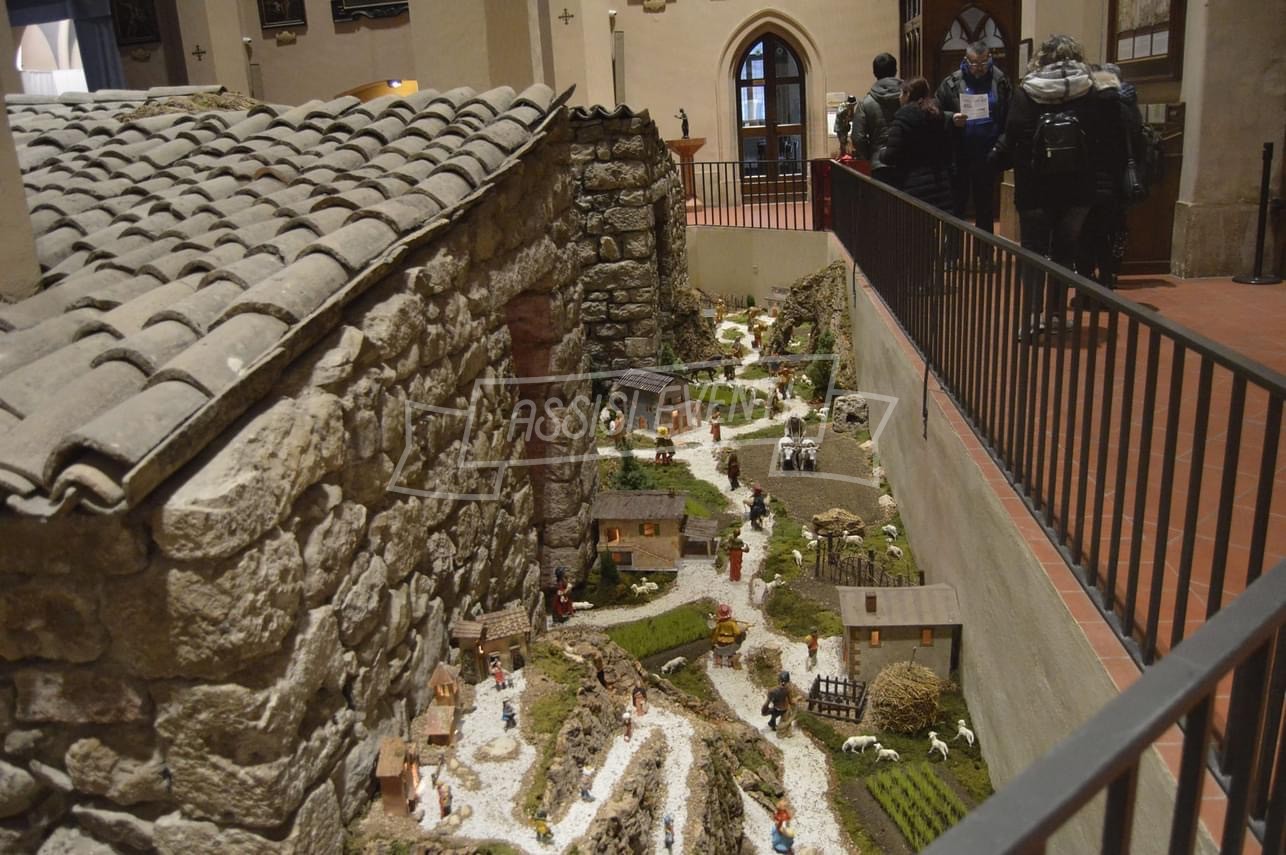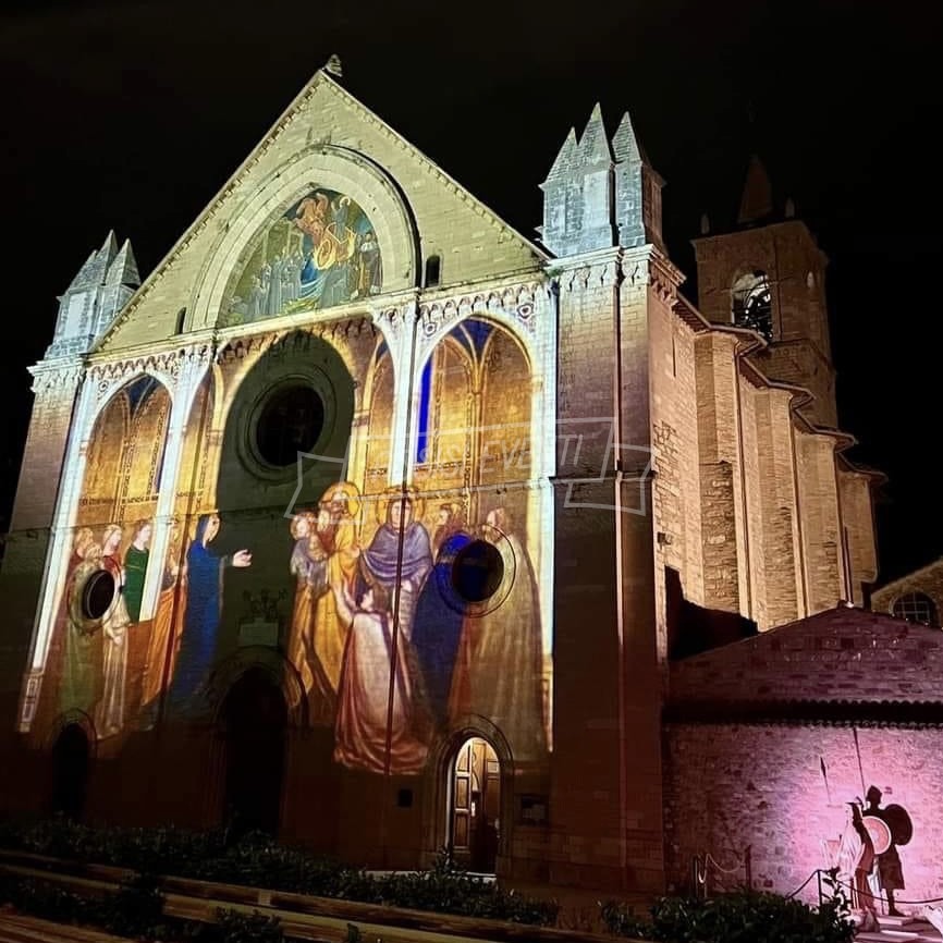 Le immagini, che illuminano la bella facciata neogotica, invitano ad entrare per visitare il bellissimo presepe della tradizione umbra realizzato, da oltre cinquant’anni, intorno al Sacro Tugurio di San Francesco. (Continua dopo la foto)