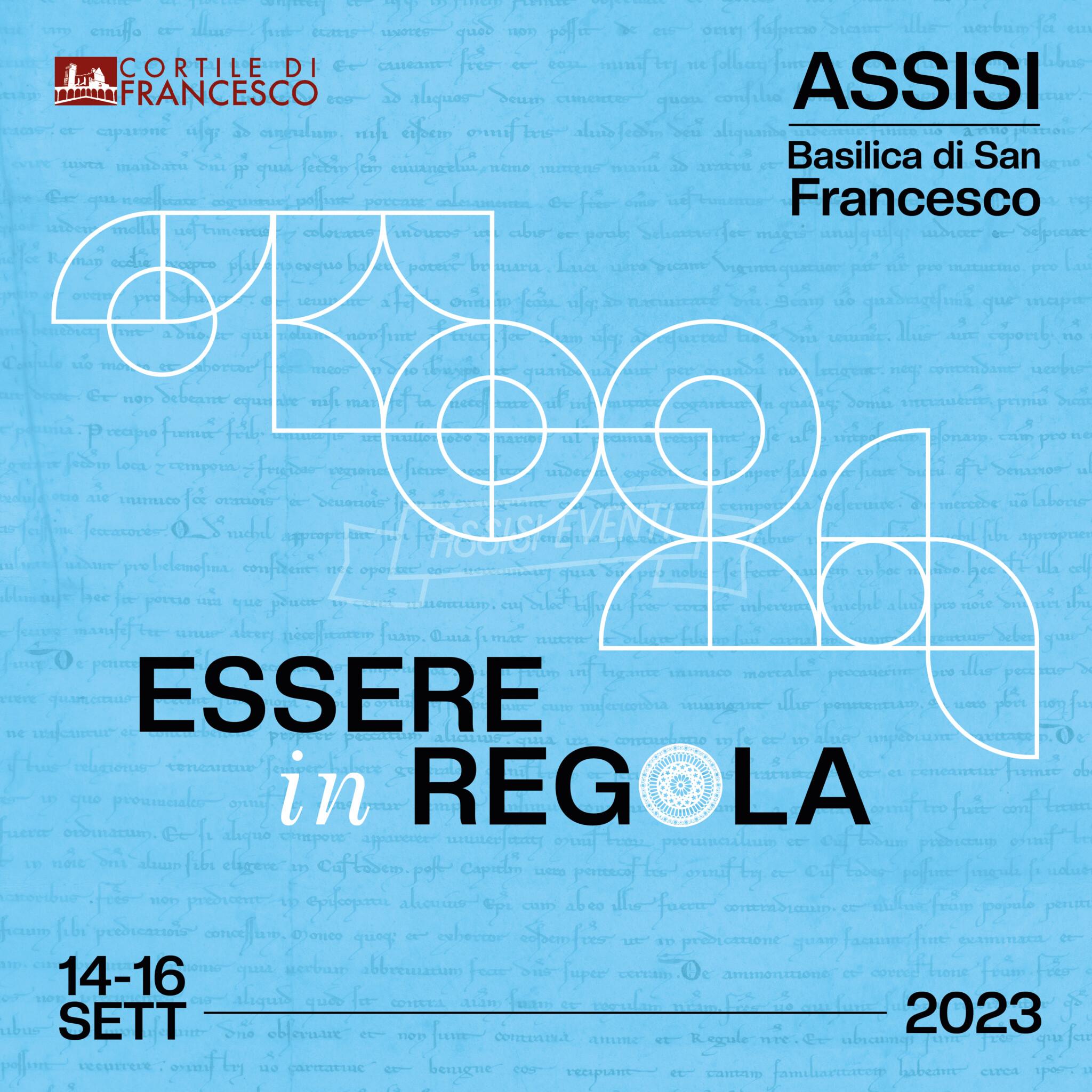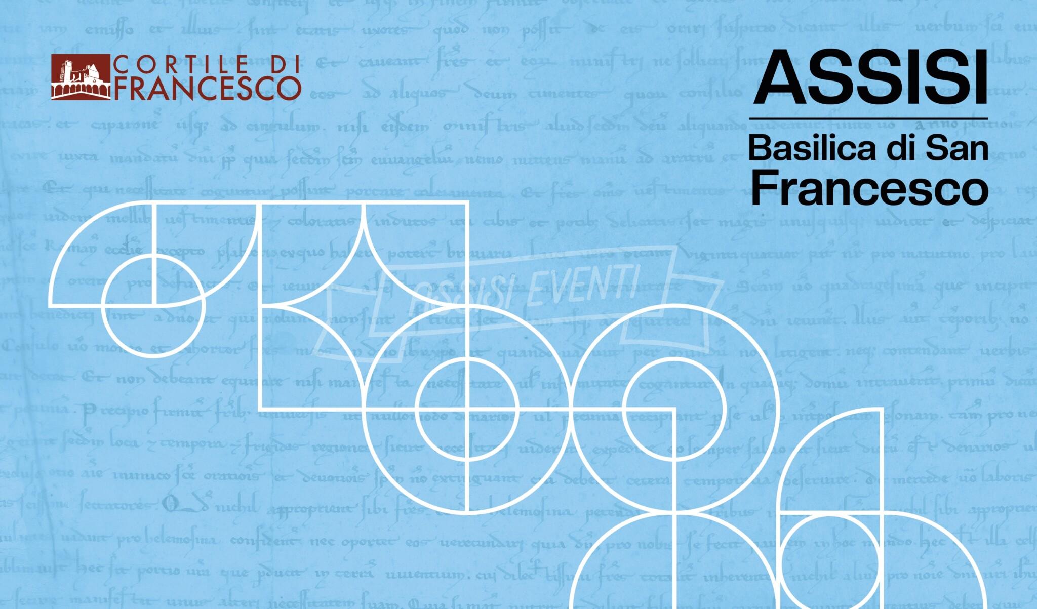 L’elaborato grafico del Cortile è stato concepito attraverso una riflessione sul significato della parola “regola”, associando a questa alcuni segni grafici. La “regola” è riconoscibile graficamente nella presenza di alcune forme geometriche e nell’essenzialità e l’uniformità delle scelte cromatiche. Inoltre, sono presenti rimandi all’universo francescano, ovvero il pattern sullo sfondo contenente la versione originale della Regola bollata (1223) scritta a mano e la sostituzione della lettera “O” con il rosone, simbolo chiave della Basilica.