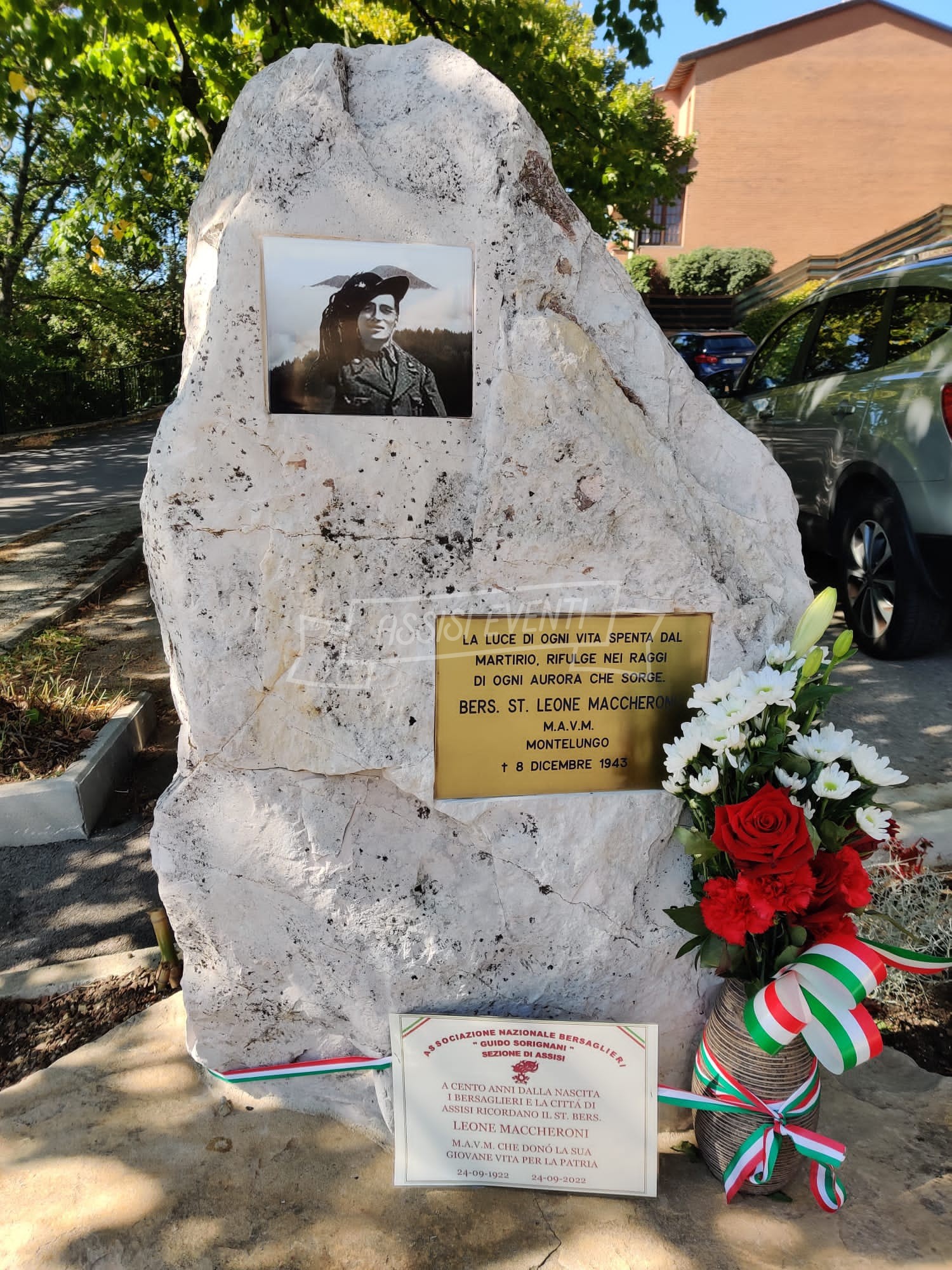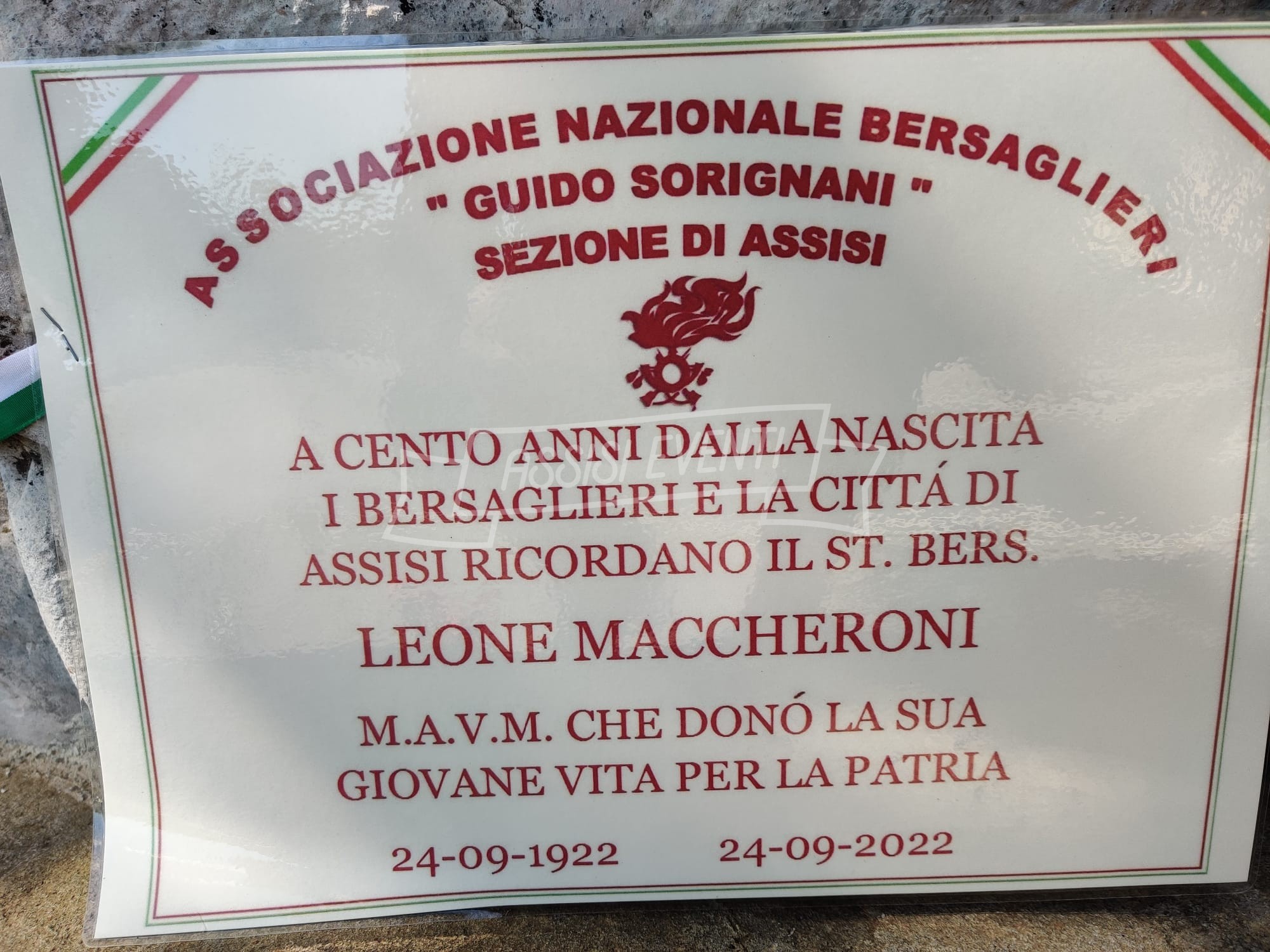 L’Associazione Nazionale Bersaglieri “Guido Sorignani” di Assisi, a cento anni dalla nascita, ha voluto ricordare il Bersagliere Leone Maccheroni. Il ricordo, sulla lapide installata ad Assisi, fuori alle mura. Sulla lapide la scritta: “La luce di ogni vita spenga dal martirio rifulge nei raggi di ogni aurora che sorge”. Unitamente alla Sezione Bersaglieri di Assisi hanno collaborato per ricordare il compianto bersagliere proprio i residenti di via Leoni Maccheroni.