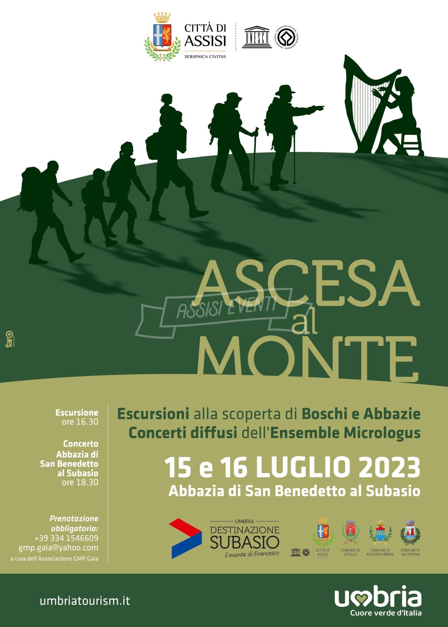 Un percorso ad anello fra sacro e profano, immersi nella natura del Parco regionale del Subasio, alla scoperta di boschi e antiche abbazie, con concerti diffusi dell’ensemble Micrologus. È il tema dell’iniziativa “Ascesa al Monte”, promossa dall’ufficio turismo del Comune di Assisi e in programma il 15 e il 16 luglio prossimi. L’evento – nel cartellone di “Assisi Estate 2023” – nasce nell’ambito del progetto “Destinazione Subasio”, che unisce i comuni interni all’area naturale protetta (Assisi, Spello, Nocera Umbra e Valtopina), costituitisi in associazione per la gestione di oltre settemila ettari di particolare pregio naturalistico e paesaggistico.