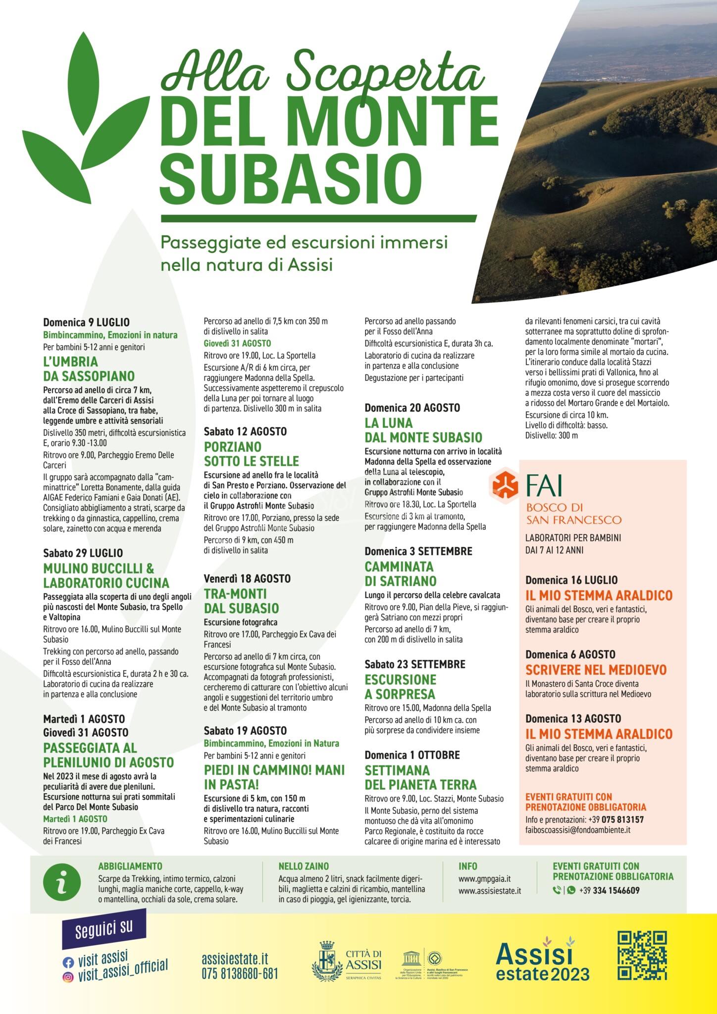 Oltre a questa iniziativa, è particolarmente ricco il programma delle passeggiate ed escursioni alla scoperta del Monte Subasio previsto in “Assisi Estate 2023”, cartellone degli eventi estivi promosso dal Comune in collaborazione con varie realtà associative del territorio. Si comincia il 9 luglio con “Bimbincammino, Emozioni in natura”, percorso ad anello dall’Eremo delle Carceri di Assisi alla Croce di Sassopiano, tra fiabe, leggende umbre e attività sensoriali. Il 29 luglio “Mulino Buccilli & Laboratorio Cucina”, passeggiata alla scoperta di uno degli angoli più nascosti del Monte Subasio, tra Spello e Valtopina. Il 12 agosto “Porziano sotto le stelle”, escursione ad anello fra le località di San Presto e Porziano, con osservazione del cielo in collaborazione con il Gruppo Astrofili Monte Subasio. Il 18 agosto “Tra-Monti dal Subasio”, escursione fotografica sul Monte Subasio al tramonto.