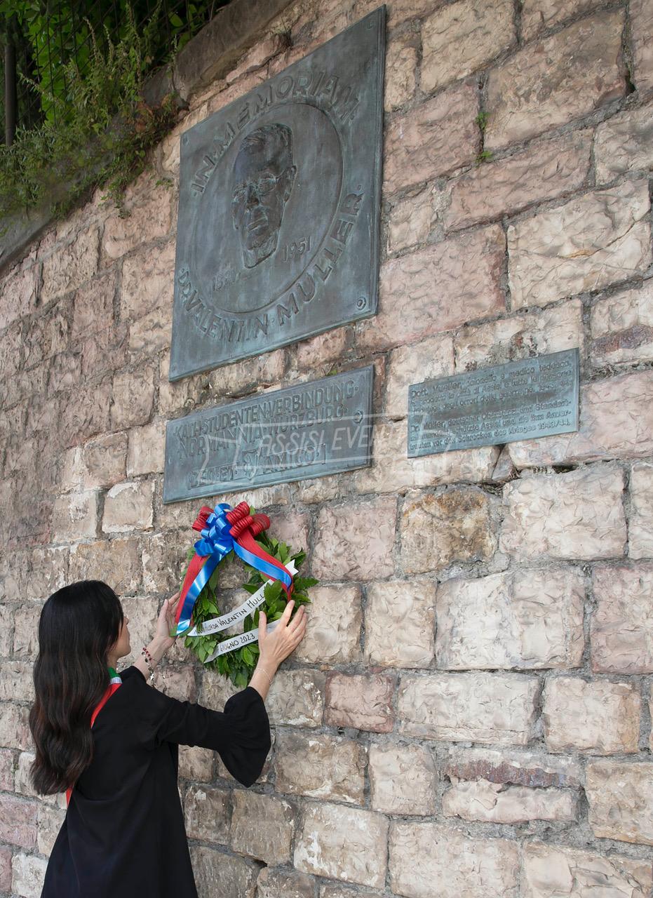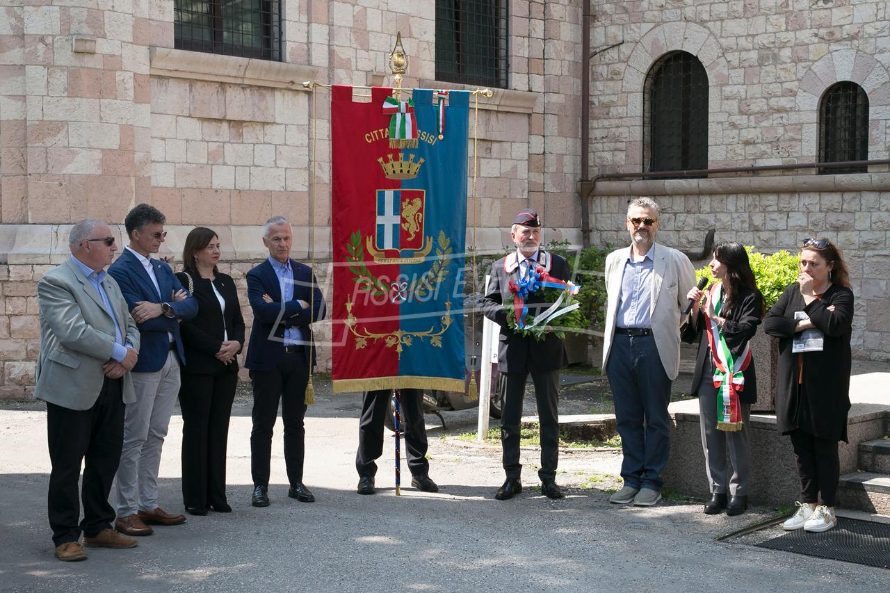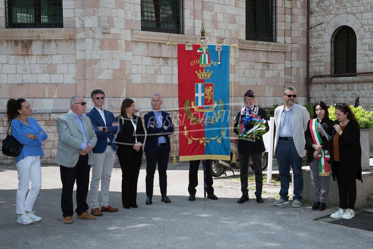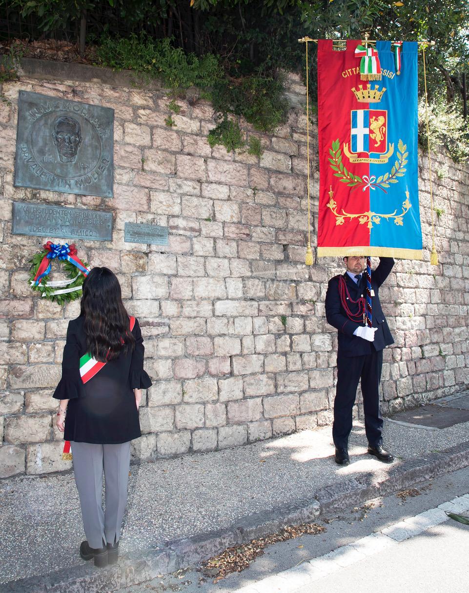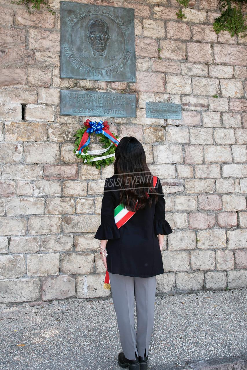 Ci si è poi spostati tutti di fronte alla lapide di Muller, fatta ripulire dall’amministrazione, per rendere omaggio al colonnello che si adoperò per salvare Assisi dai bombardamenti e farla dichiarare città ospedaliera (uno degli ospedali tedeschi era allestito proprio al Serafico). Il sindaco Proietti ha deposto una corona di alloro e si è osservato un minuto di silenzio