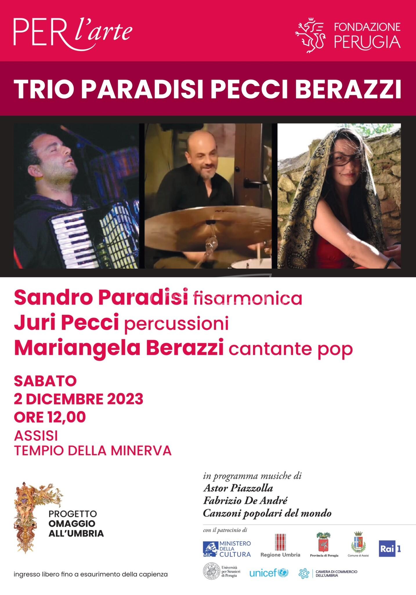Un concerto all’interno del magnifico Tempio della Minerva, nel centro di Assisi, per avvicinarsi alla magia del Natale. L’appuntamento è per sabato 2 dicembre 2023, alle ore 12.00. Voluto e sostenuto da Fondazione Perugia, l’evento è organizzato dal Progetto Omaggio all’Umbria e vedrà esibirsi il trio Paradisi Pecci Berazzi, specializzato nella grande musica popolare. L’ingresso è libero fino a esaurimento della capienza.