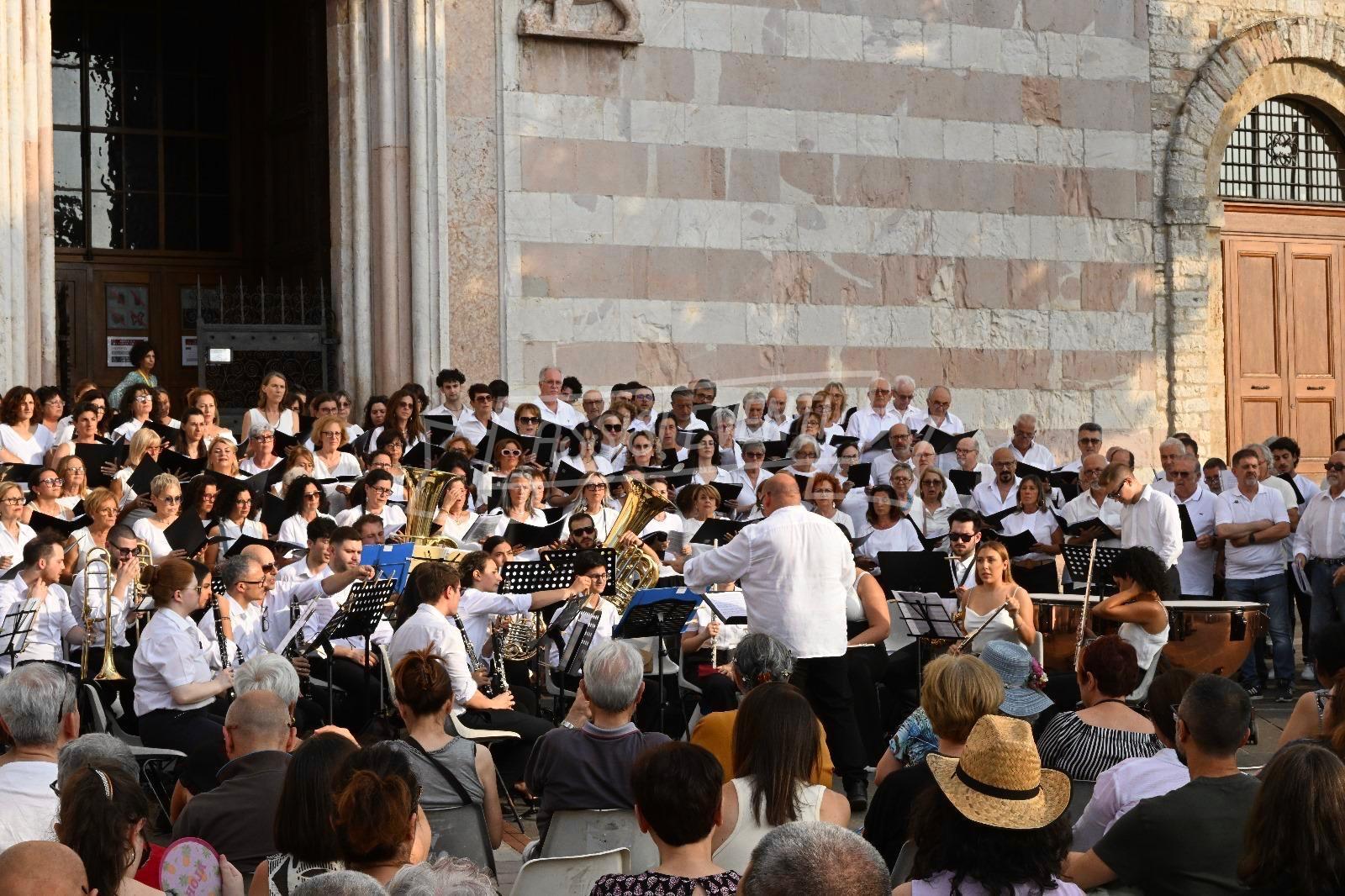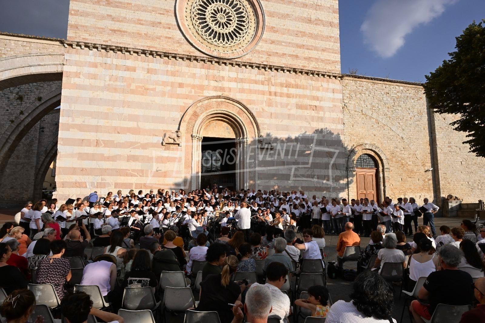 Il testimone della musica è poi passato, alle ore 19:30, alla piazza di Santa Chiara, dove 21 cori provenienti da cinque regioni italiane si sono riuniti per condividere la gioia del canto insieme in uno scenario di incredibile bellezza, mentre la luce dorata del tramonto tingeva di magia le antiche mura della Città Serafica. Il programma ha proposto due opere intense e significative: Il Cantico delle Creature di padre Domenico Stella e la Missa Brevis di Jacob de Haan, composta per celebrare il millenario dell’elezione di papa Leone IX. A dirigere le voci riunite, il maestro Vladimiro Vagnetti, con l’accompagnamento dell’Orchestra di Fiati “Concerto Musicale F. Morlacchi” di Cannara, diretta dal maestro Francesco Verzieri.