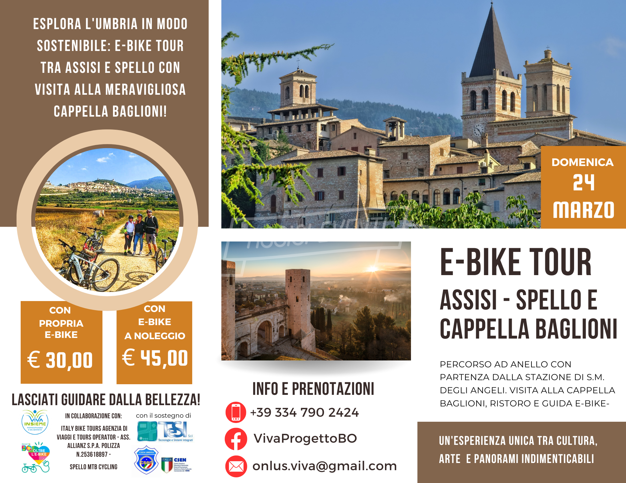 C’è anche un tour dell’associazione Vi.Va. tra le iniziative della Pasqua nella città serafica, con un emozionante e-bike tour tra Assisi e Spello che inizia alle 8.30 di domenica 24 marzo 2024 dalla stazione ferroviaria di Assisi, raggiunge la Basilica di San Francesco passando per la “Mattonata”, per poi arrivare in piazza del Comune e terminare, passando per via degli Ulivi, a Spello, prima al Belvedere, che regala una vista mozzafiato sulla Valle Umbra, e poi nella Chiesa di Santa Maria Maggiore con una visita guidata alla Cappella Baglioni, tesoro rinascimentale con opere del Pinturicchio e del Perugino.