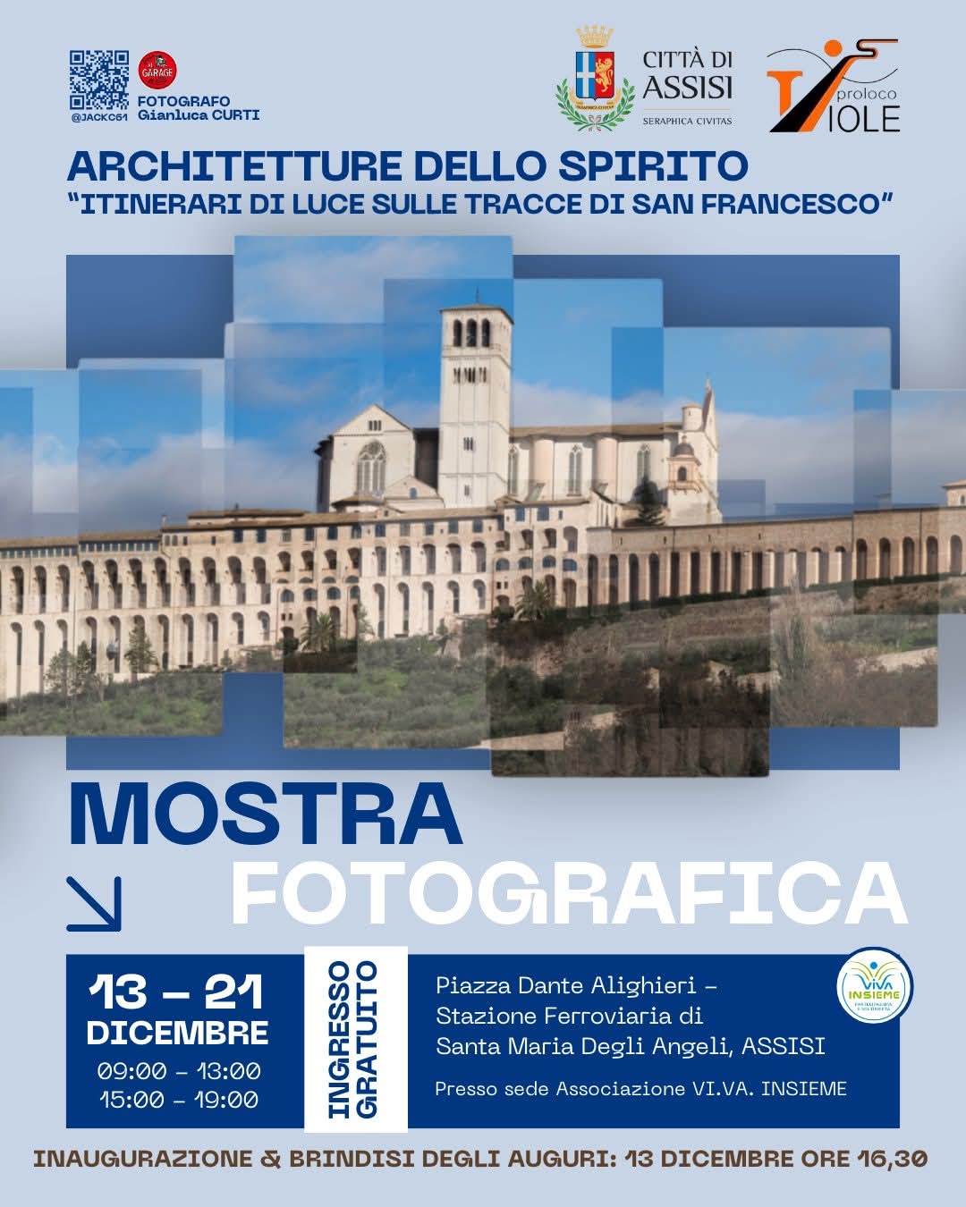 In occasione dell’ottavo centenario della morte di San Francesco d’Assisi, la Stazione ferroviaria di Santa Maria degli Angeli ospita Architetture dello Spirito – Itinerari di luce sulle tracce di San Francesco, la nuova mostra fotografica firmata da Gianluca Curti. L’inaugurazione è in programma sabato 13 dicembre alle ore 16:30, con un brindisi augurale aperto al pubblico. L’esposizione resterà visitabile fino al 21 dicembre negli spazi dell’Associazione VI.VA., in Piazza Dante Alighieri ad Assisi.