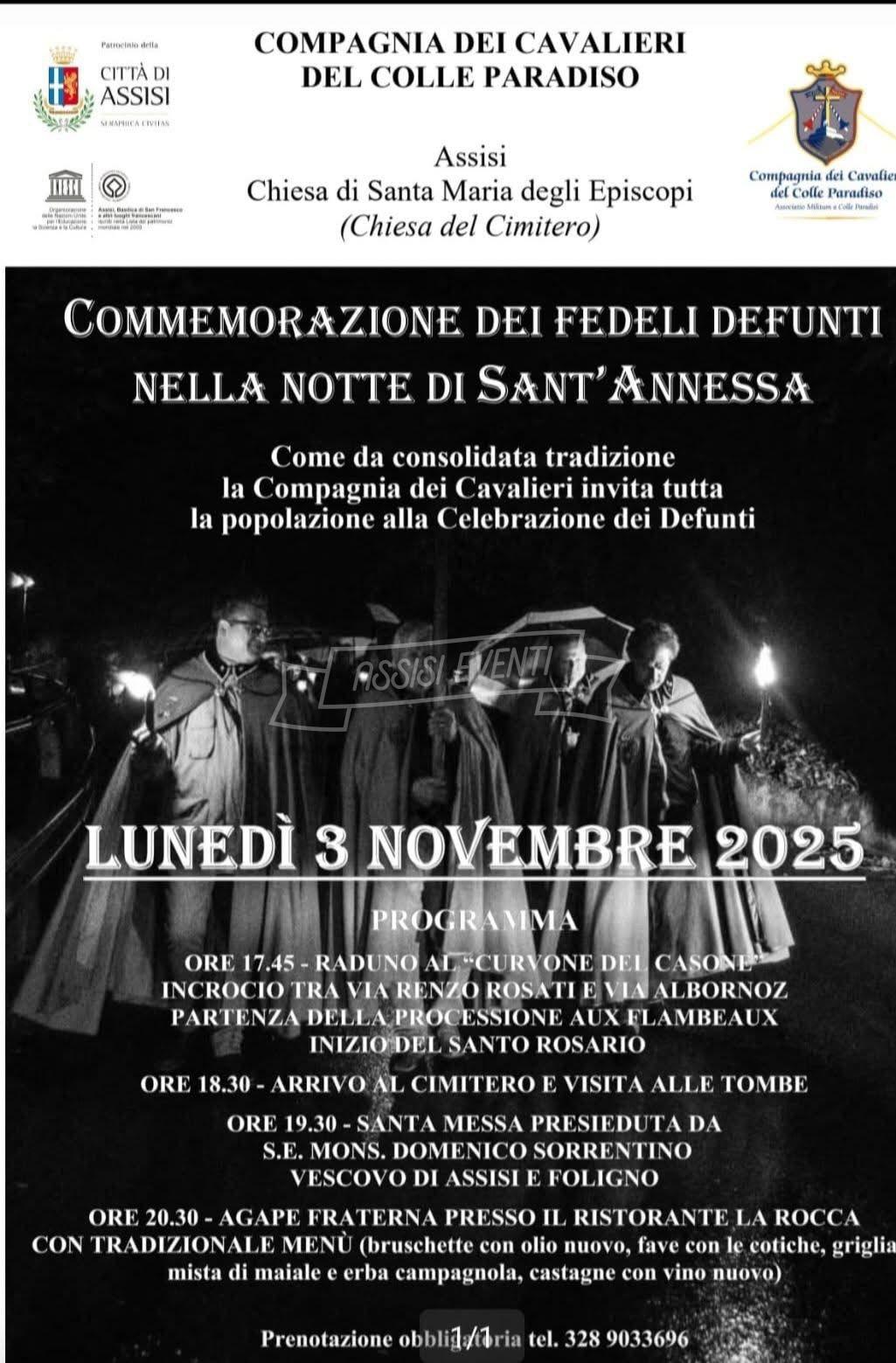 Ad Assisi, la Compagnia dei Cavalieri del Colle Paradiso celebra la Commemorazione dei Fedeli Defunti nella Chiesa di Santa Maria degli Episcopi, con la tradizionale processione aux flambeaux e la Santa Messa presieduta da Mons. Domenico Sorrentino, Vescovo di Assisi e Foligno. La serata si conclude con un momento conviviale al Ristorante La Rocca, con piatti tipici e vino nuovo; la partecipazione richiede prenotazione.