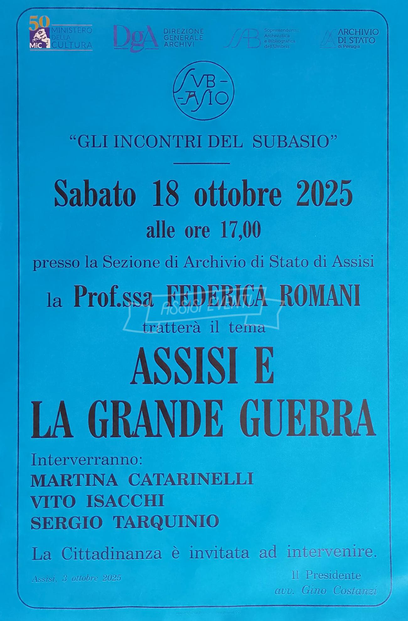 Il Ministero della Cultura, DgA Direzione Generale Archivi, la Soprintendenza Archivistica e Bibliografica dell’Umbria, e l’Archivio di Stato di Perugia presentano “Gli Incontri del Subasio”. Sabato 18 ottobre 2025, alle ore 17:00, presso la Sezione di Archivio di Stato di Assisi, la prof.ssa Federica Romani terrà una conferenza sul tema “Assisi e la Grande Guerra”. Parteciperanno anche Martina Catarinelli, Vito Isacchi e Sergio Tarquinio. La cittadinanza è cordialmente invitata a prendere parte all’incontro. Assisi, 3 ottobre 2025. Il Presidente, avv. Gino Costanzi.