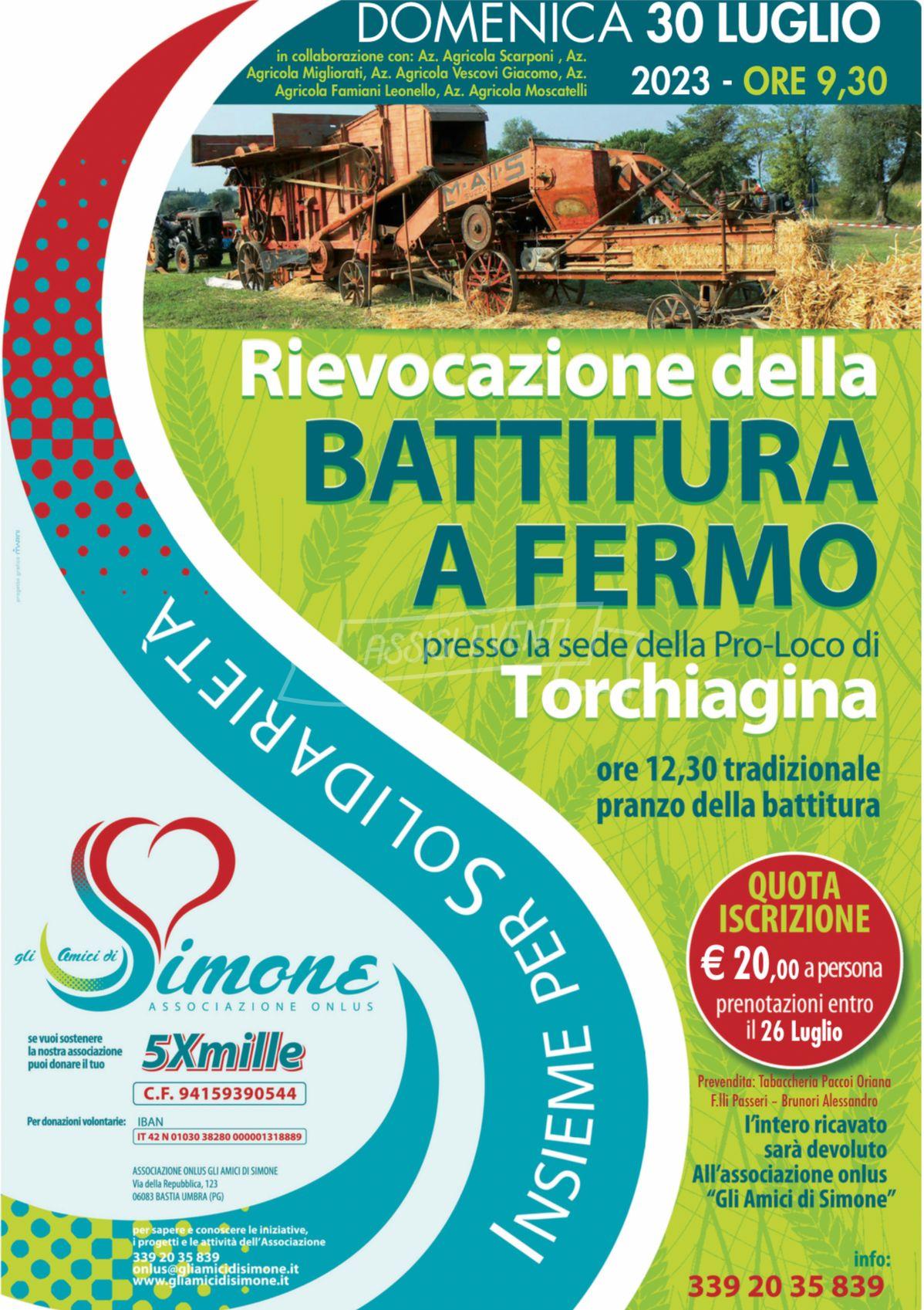 Domenica 30 luglio alle ore 9,30 presso la sede della Pro Loco Torchiagina si terrà la Rievocazione della battitura a fermo. Alle ore 12,30 il tradizionale pranzo della battitura. L’intero ricavato sarà devoluto all’Associazione onlus “Gli Amici di Simone”.