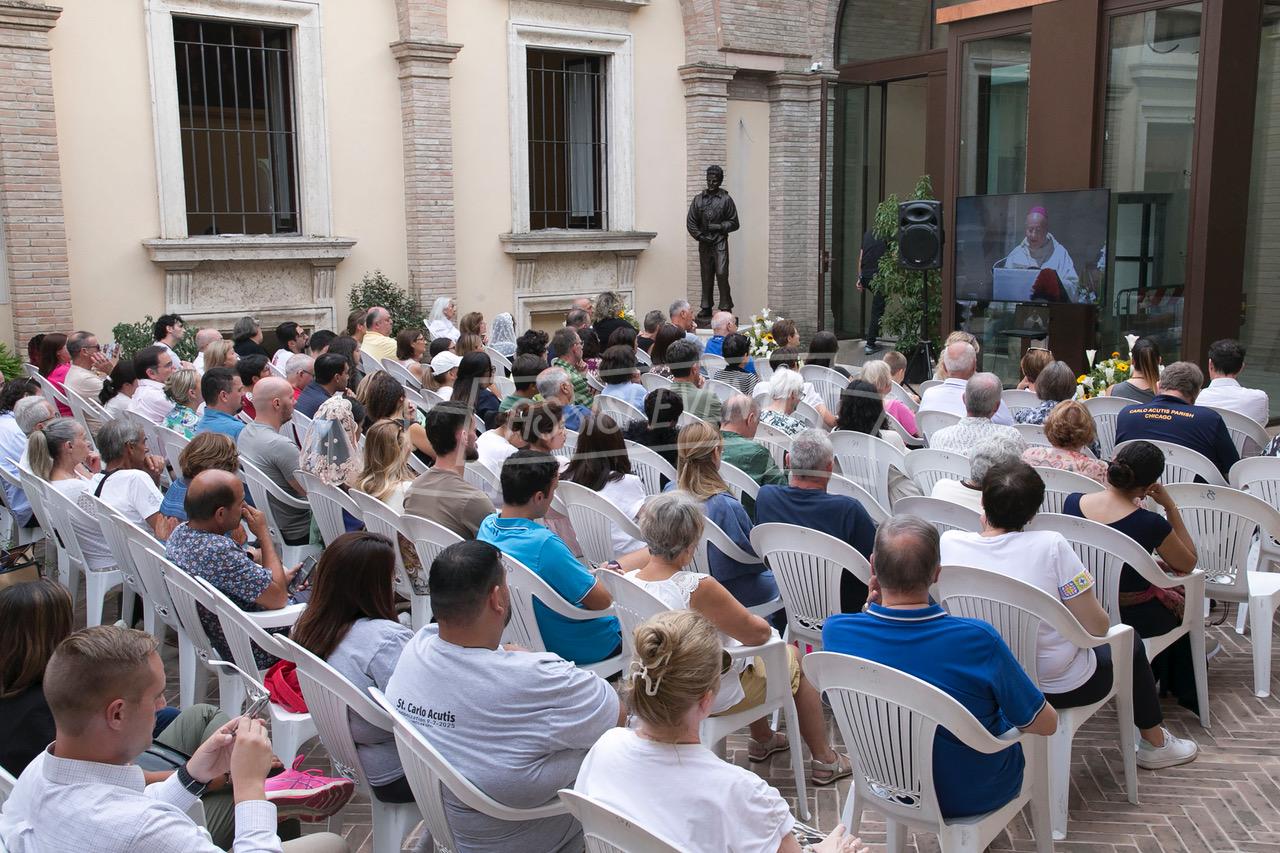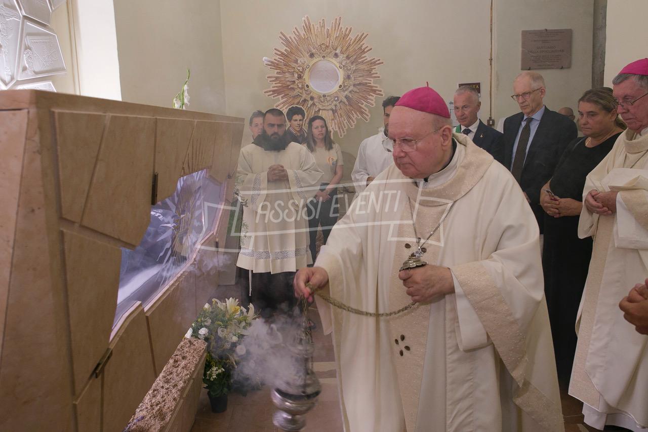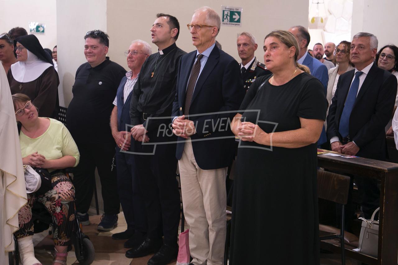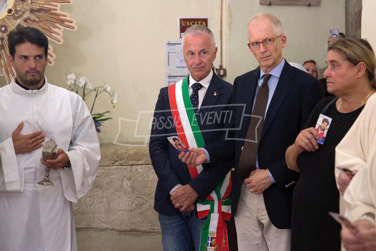 Alla cerimonia, commossi, erano presenti anche i genitori del Santo, Antonia Salzano e Andrea Acutis, il sindaco di Assisi, Valter Stoppini, la presidente della Regione, Stefania Proietti, le principali autorità civili, militari e religiose locali e regionali. Tanti i pellegrini e i fedeli presenti, una folla festosa che per tutta la giornata ha animato e colorato la piazza di Assisi dove sorge il complesso del Santuario della Spogliazione. “Ieri a piazza San Pietro, insieme con Pier Giorgio Frassati, Carlo si elevava nel firmamento della Chiesa e della società come una stella. C’è una diffusa tendenza, nella nostra società dell’immagine, una tendenza che forse è visibile soprattutto nei giovani, a cercare una ‘star’ con cui identificarci. Sarà quel cantante, quell’attore, quel campione, quella personalità. Proviamo se non a ribaltare, almeno ad integrare, la nostra volta stellare. Cominciamo a fissare le `star’ che non tramontano. Le stelle accese da Dio nel nostro firmamento, i santi. Carlo è stato voluto così, come una stella di intensa luce, ma di forma semplice; Carlo è di poche parole, ma comprensibili e che toccano il cuore. È stato messo accanto a Francesco e Chiara, perché ciascuno, levando gli occhi al cielo, potesse trovare in questo trio quello di cui ha bisogno. (…) Ma – ha messo in guardia il vescovo – occorre stare attenti ai moti del suo sguardo, che ti trascinano subito verso Gesù. Jesus Christ super star. È solo Gesù ‘la luce del mondo, la stella che non tramonta. Francesco e Carlo lo dicono insieme. Bisogna che l’immagine programma che accoglie i pellegrini all’ingresso di questo santuario non sfugga. C’è Francesco, c’è Carlo, ma sono ai lati. Mani, sguardo, cuore, sono interamente per Gesù. Lavorano per lui. Sono gli operai del suo cantiere: al Santo Padre, che ho incontrato oggi, ho detto che non vedo l’ora di invitarlo a vedere questa grande opera, il disegno mirabile di un Santuario che parte da così lontano e guarda così lontano, al terzo millennio della chiesa che è e deve essere il millennio di Gesù. E Carlo amplifica questo desiderio e con Francesco ambedue producono e irradiano gioia”.