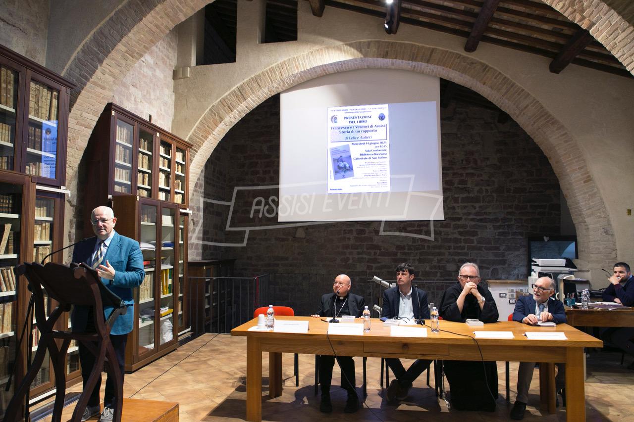 “Il libro è una rilettura storica attenta, una riscoperta, accompagnata dall’intuizione spirituale, di una storia attuale e suggestiva e forse poco conosciuta. Anche la riscoperta del vescovado con i lavori al Santuario della Spogliazione è una restituzione di Francesco alla città”. Lo ha detto il vescovo delle diocesi di Assisi – Nocera Umbra – Gualdo Tadino e di Foligno, monsignor Domenico Sorrentino durante la presentazione del libro “Francesco e i vescovi di Assisi, storia di un rapporto”, scritto dal frate minore conventuale padre Felice Autieri che si è tenuta mercoledì 14 giugno nel pomeriggio nella sala conferenza della Biblioteca diocesana situata nel complesso della cattedrale di San Rufino ad Assisi.