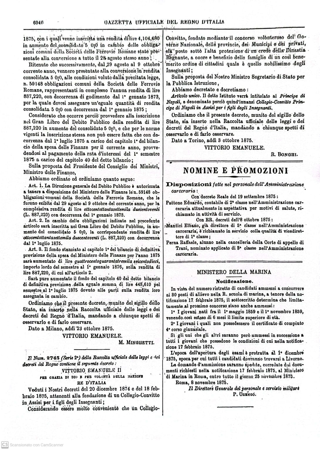 Il 4 ottobre 1875, presso le stanze del Sacro Convento di Assisi,veniva inaugurato dall’allora Ministro per l’Istruzione Ruggero Bonghi il Convitto Nazionale “Principe di Napoli”, aseguito del Regio decreto n. 2388 del 18 Febbraio 1875, che ne prevedeva l’istituzione. Intitolandolo al Principe di Napoli, il re d’Italia Vittorio Emanuele II poneva l’istituto sotto l’altaprotezione dell’erede della dinastia regnante (R.D. 2745 del 3 ottobre 1875).