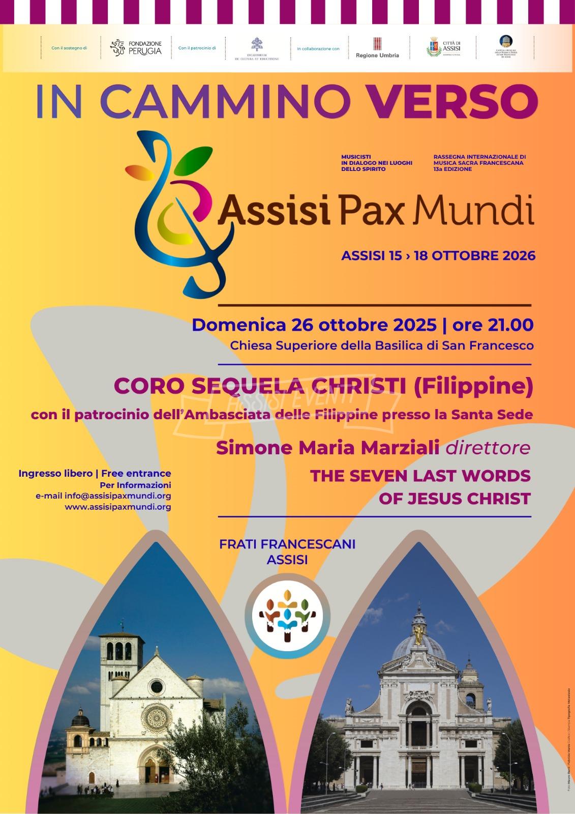 Il concerto vedrà l’esecuzione di “The seven last words of Jesus Christ”, un’opera che sarà presentata sotto la direzione del Maestro Simone Maria Marziali. Protagonista della serata sarà il Coro Sequela Christi, proveniente dalle Filippine. Il gruppo si esibirà con il patrocinio dell’Ambasciata delle Filippine presso la Santa Sede. Si ricorda che l’ingresso è libero per tutti gli spettatori. Anche questo appuntamento di Assisi Pax Mundi è organizzato dalla Famiglia Francescana di Assisi, con il sostegno della Fondazione Perugia, il patrocinio del Dicastero per la Cultura e l’Educazione, e con la collaborazione di Regione Umbria, Città di Assisi, Cappella Musicale della Basilica Papale di San Francesco, che, per motivi logistici non potrà invece partecipare all’evento del 25 dedicato al Trittico di San Francesco.