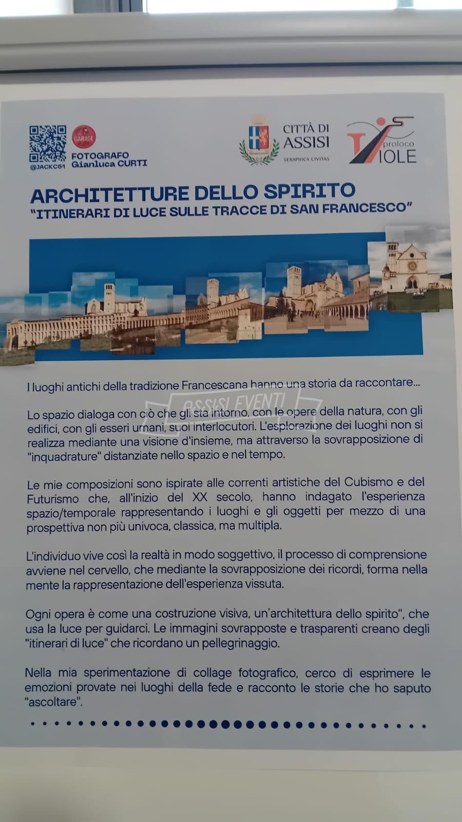La mostra si inserisce nel programma degli OttocentenariFrancescani e intende celebrare l’eredità spirituale di San Francesco attraverso un percorso visivo dedicato a dodici architetture francescane di Assisi. Il percorso espositivo si sviluppa come una stratificazione di inquadrature distanti nel tempo e nello spazio, dando forma a una visione frammentata e contemplativa, in cui luce, memoria e architettura dialogano tra loro.