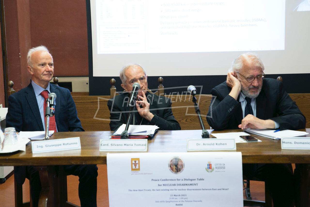 “Una commissione permanente con esperti russi e americani, che possa lavorare in collaborazione con i leader cattolici e delle altre religioni, per cercare soluzioni utili ai governi che possiedono armi nucleari per incoraggiare modi e mezzi per ridurre gli arsenali e i pericoli nucleari”. È uno dei passaggi del documento finale della conferenza di pace per un tavolo di dialogo sul disarmo nucleare svoltasi sabato 25 marzo nella Sala dei vescovi del Santuario della Spogliazione di Assisi e organizzata dal Comitato Civiltà dell’Amore, dalla Diocesi di Assisi – Nocera – Gualdo e dalla Città di Assisi.
