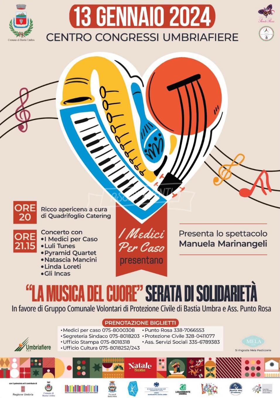 Sulle note della beneficenza con “La musica del Cuore”, direttore artistico Giulio Franceschini che da anni insieme al suo gruppo I Medici Per Caso rinnova il suo impegno per la solidarietà. Bravi gli artisti che ci hanno acconpagnati in una piacevolissima serata a favore dell’Associazione Punto Rosa e dei Volontari del Gruppo Comunale Protezione Civile Bastia Umbra. Tanti i gruppi interventi con I Medici per Caso, Luli Tunes, Pyamid Quartet, Natascia Mancini, Linda Loreti, Gli Incas. Presenti cittadini, autorità e appassionati.