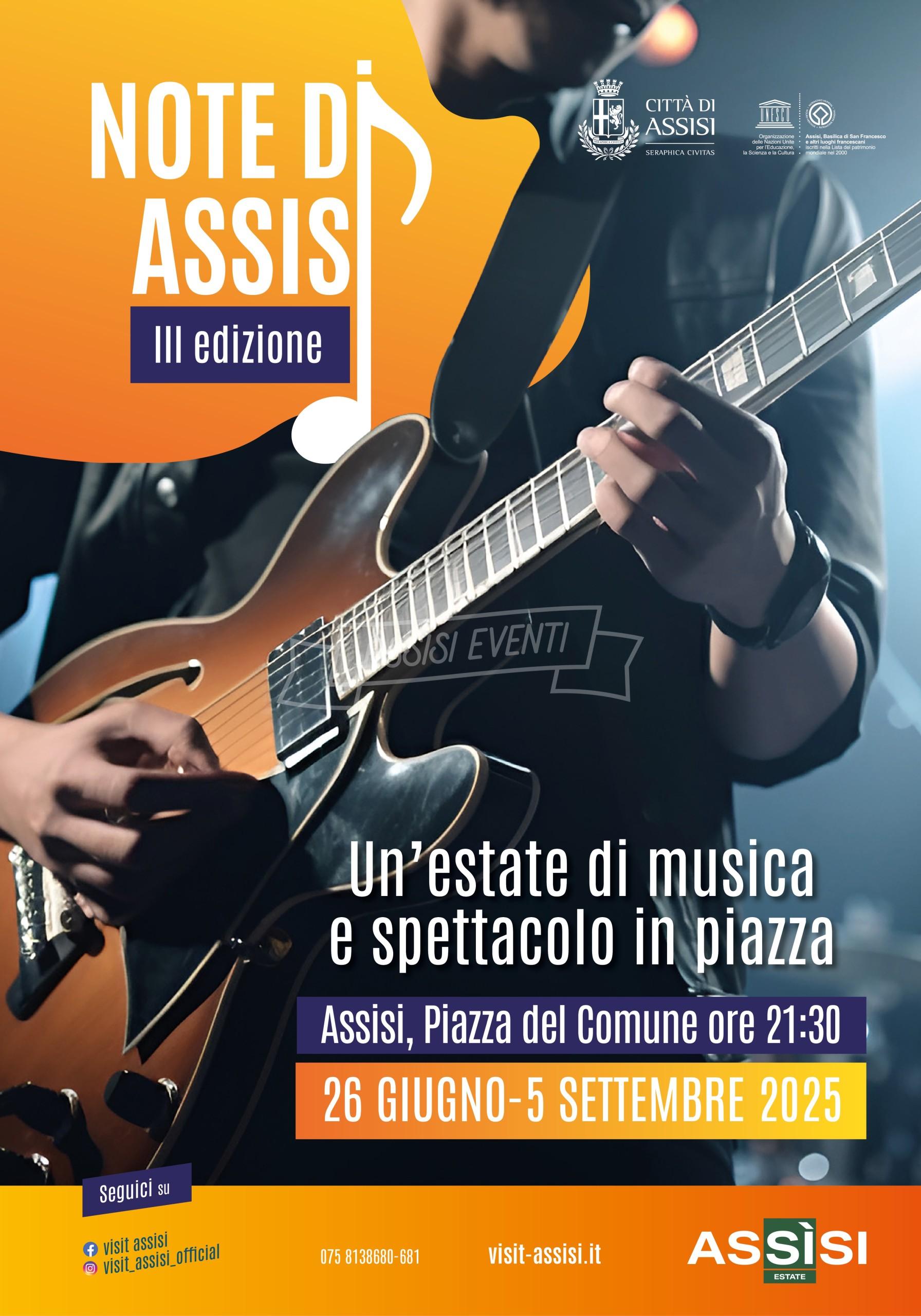 È tutto pronto per la terza edizione di “Note di Assisi 2025”, rassegna di musica e spettacolo in piazza, organizzata e promossa dal Comune di Assisi nel cartellone degli eventi estivi, con protagonisti artisti e gruppi musicali assisani e umbri.Dal 26 giugno al 5 settembre, sempre alle ore 21.30, ben 18concerti gratuiti in Piazza del Comune, nel centro storico della città serafica, davanti al suggestivo Tempio di Minerva. Un viaggio musicale sotto le stelle, che attraverserà diversi generi, dal pop al rock, dal jazz al blues, sino alla classica e al funky, accendendo tanti weekend dell’estate assisana, per offrire a cittadini e turisti momenti di svago e aggregazione di qualità.