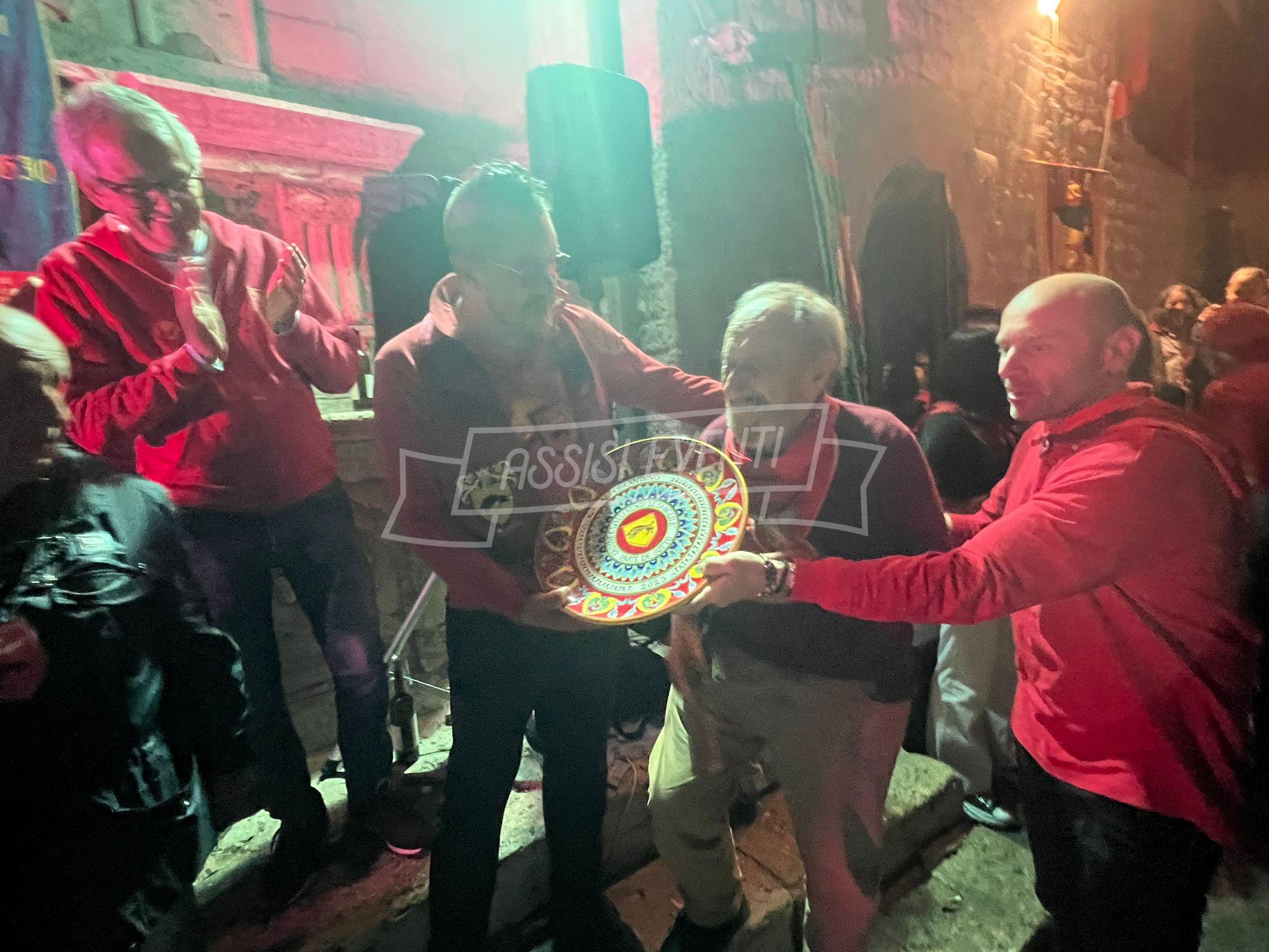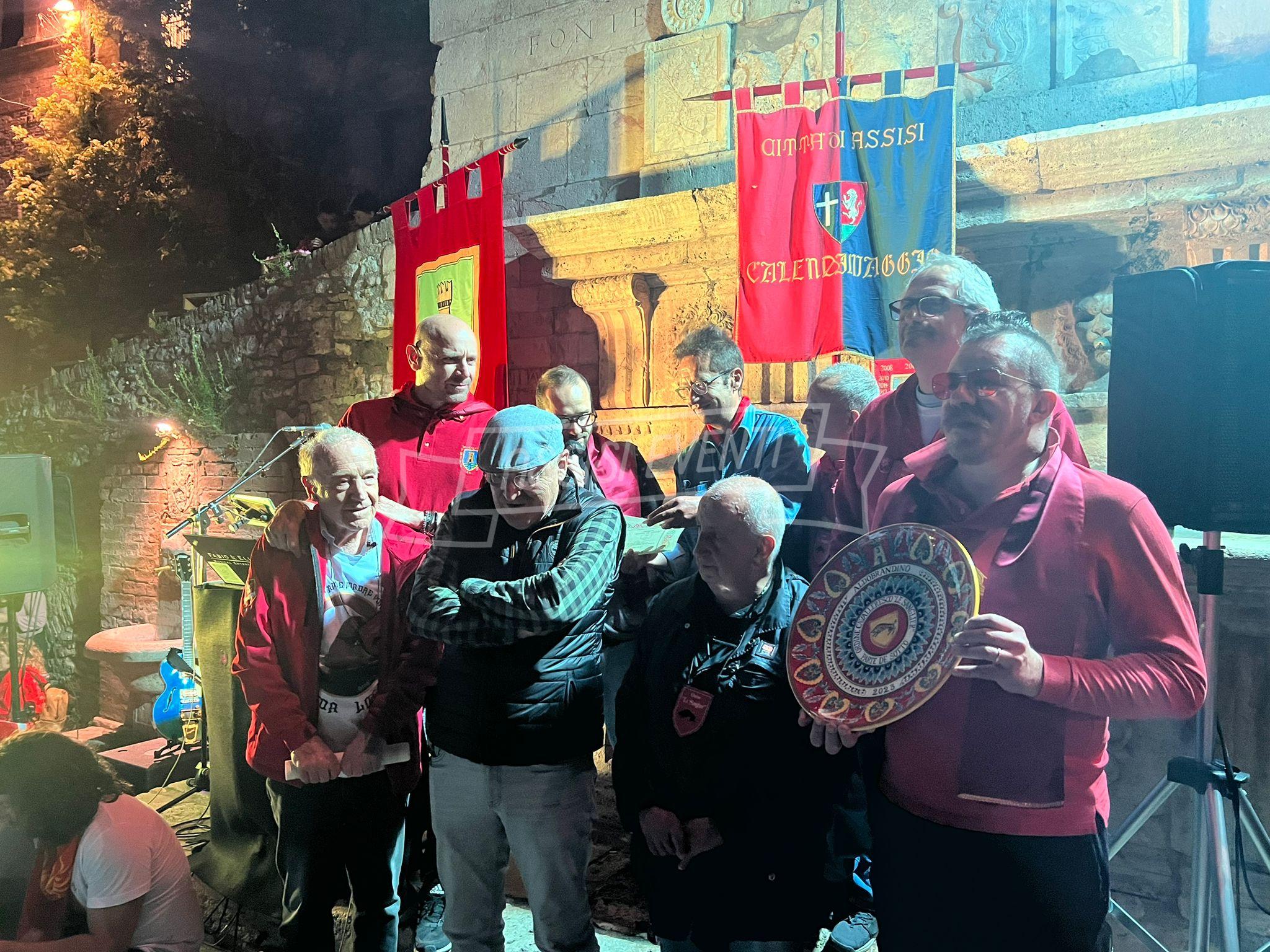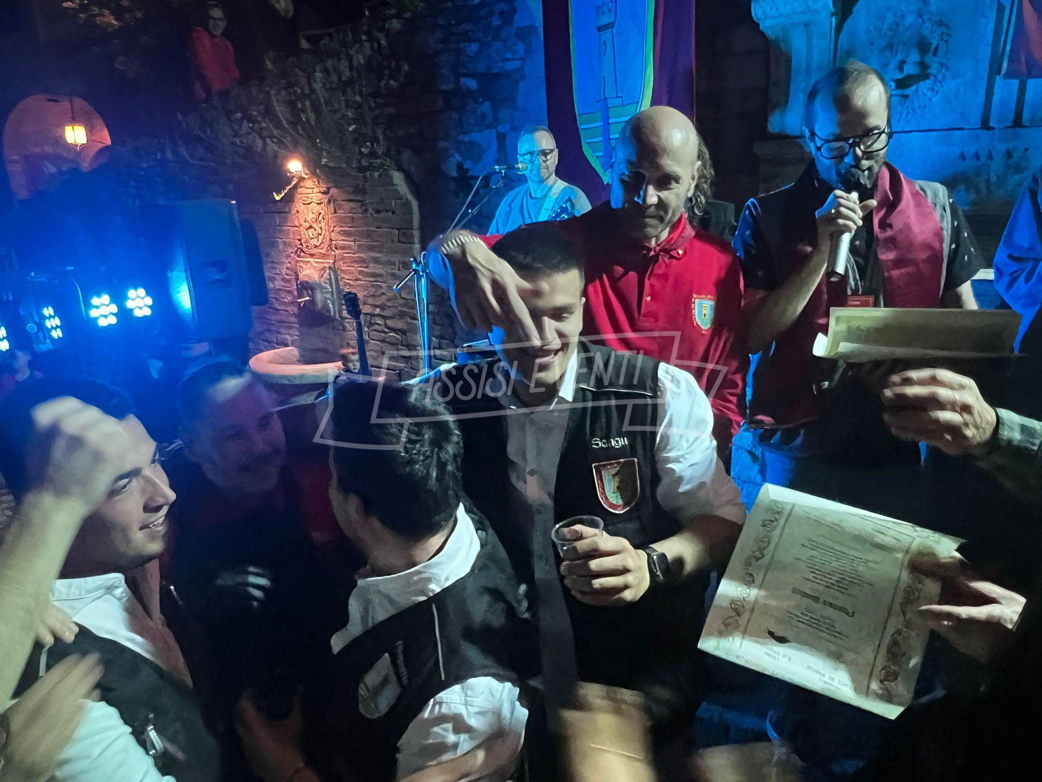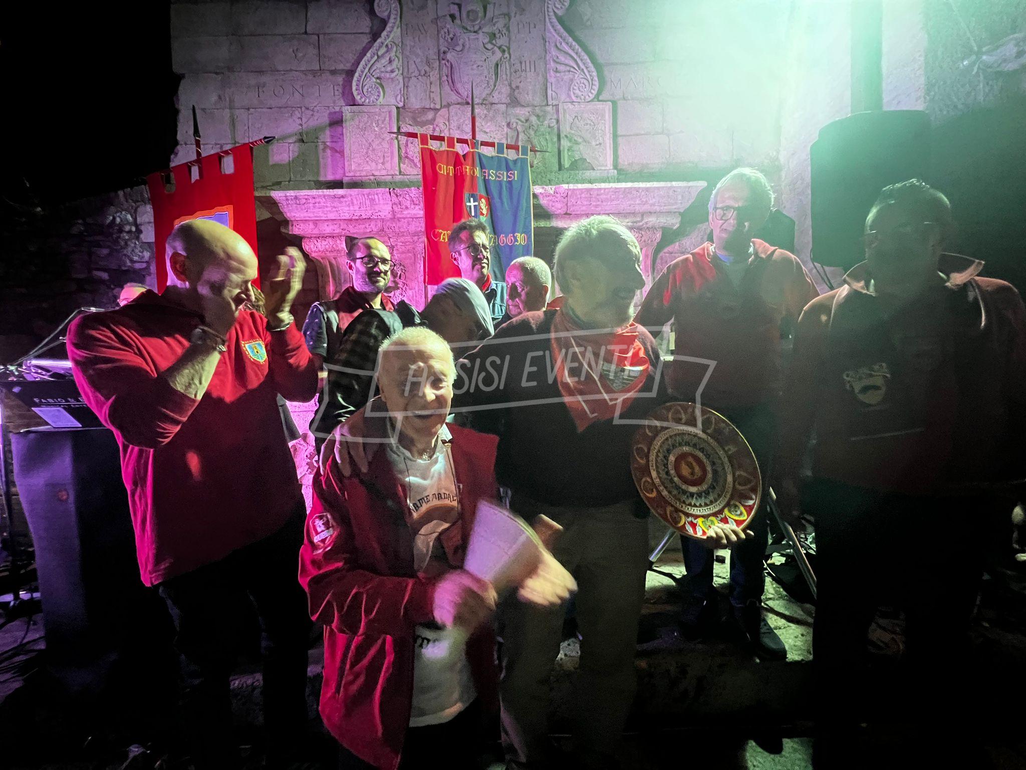 Oltre al ‘Premio Aldobrandino’ anche la consegna di un ‘Encomio Solenne’, ai tiratori della fune della Magnifica Parte de Sotto, sempre da parte del ‘Sovrano Ordine Le Sanglier’ per “aver contribuito alla vittoria di Madonna Primavera vincendo il tiro alla fune dopo molti anni”. Parte de Sotto che nell’edizione del Calendimaggio di Assisi 2023 ha infatti eletto anche la sua Madonna Primavera, con monna Anna Chiara Sarnataro. Al termine della cena, con protagonista il Palio tornato in Parte de Sotto, anche lo spettacolo pirotecnico e una rosa – rossa – in omaggio a tutte le donne della Parte.