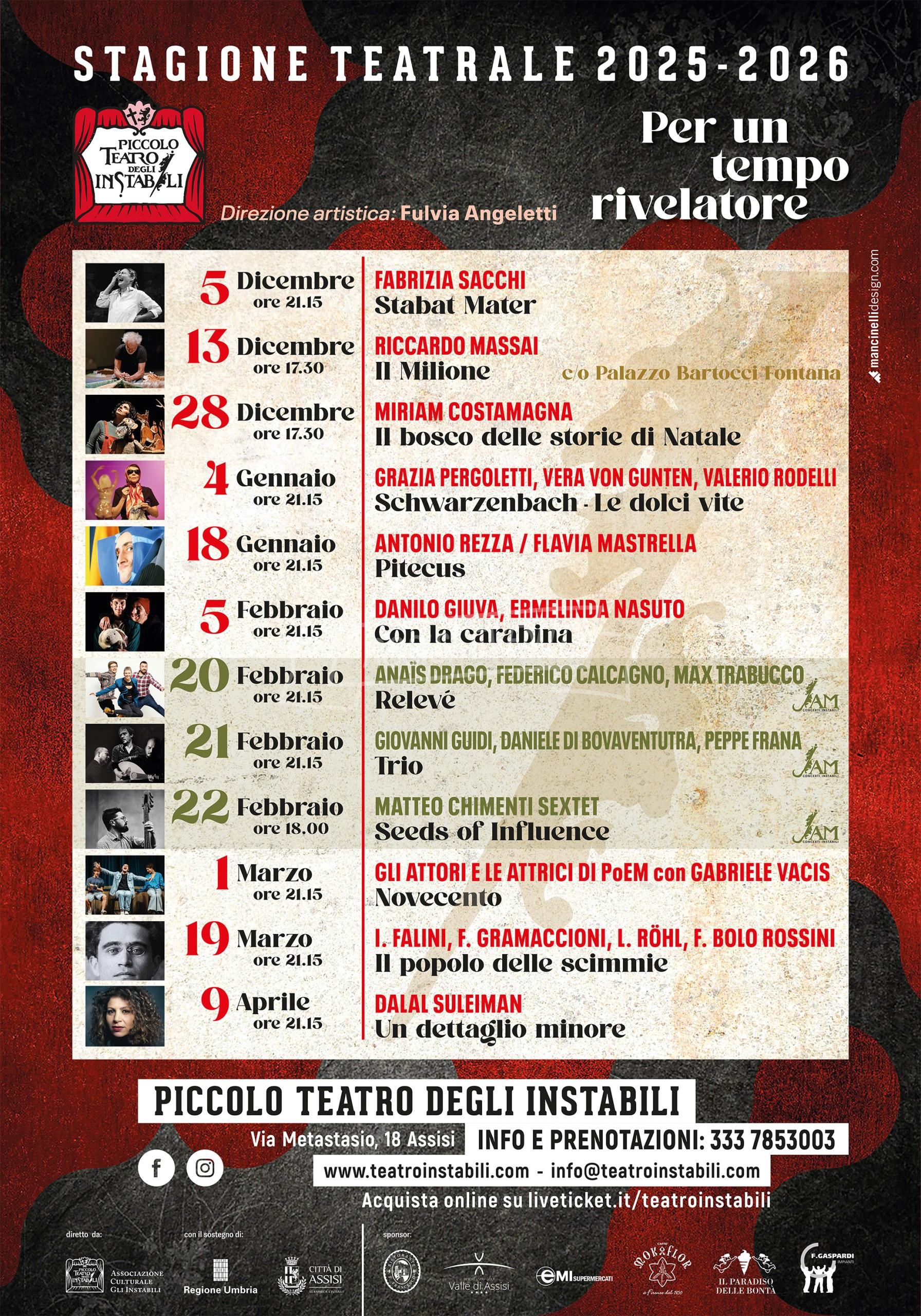 “Per un tempo rivelatore” è il titolo della Stagione Teatrale 2025/26, dedicata a Carlo Angeletti – fondatore e ideatore del Piccolo Teatro degli Instabili – nel decimo anniversario della scomparsa (2015 – 2025).