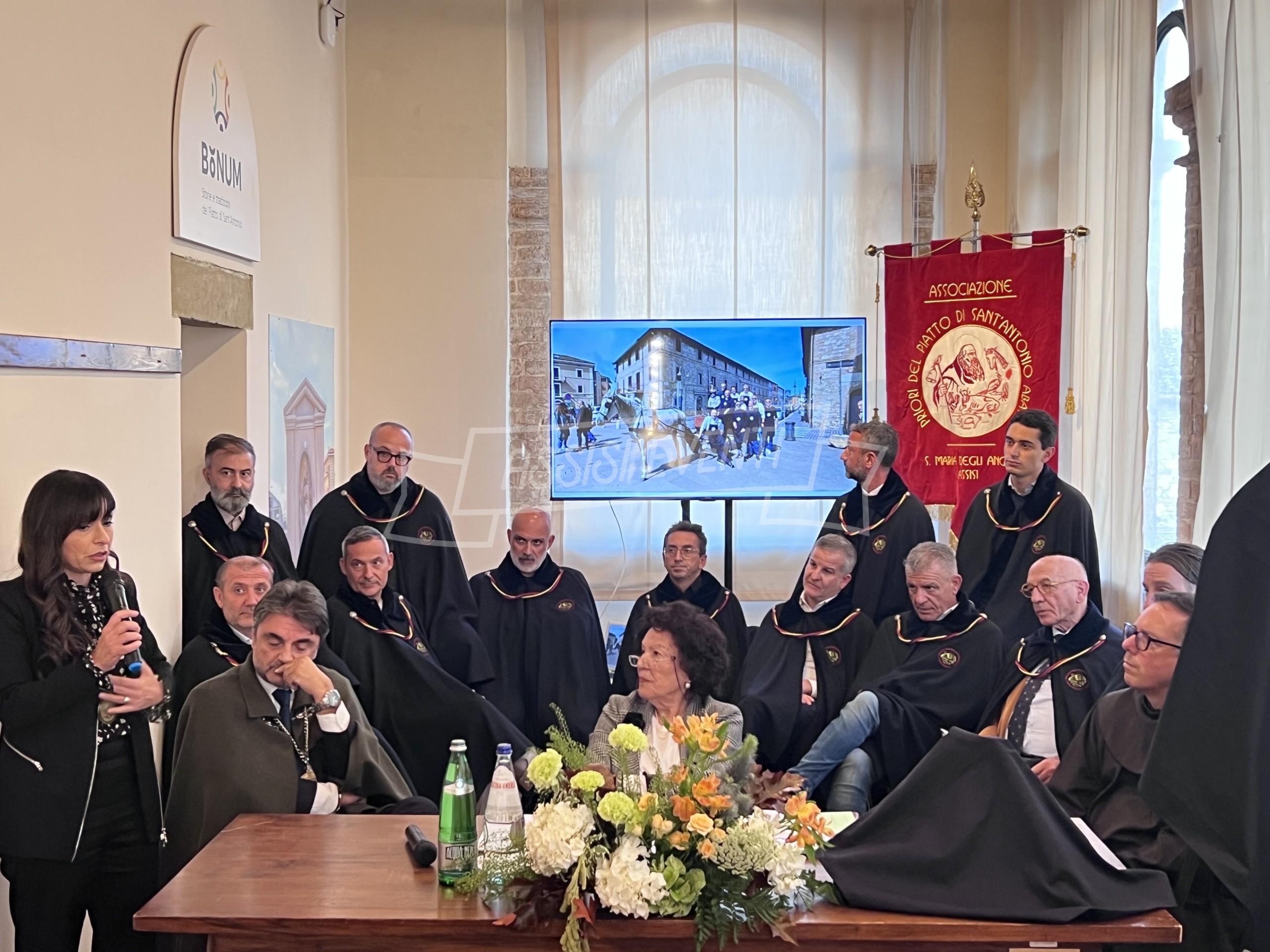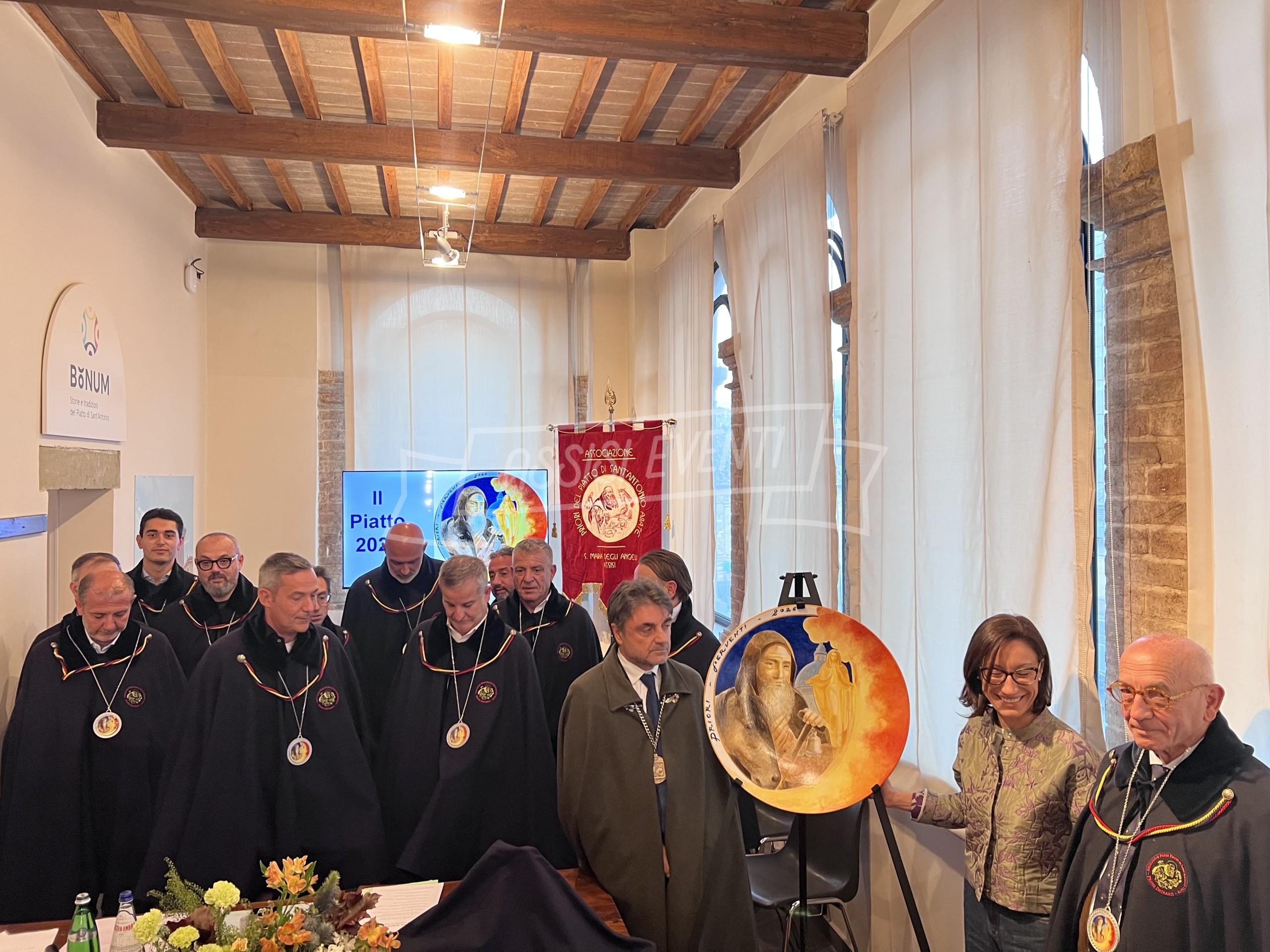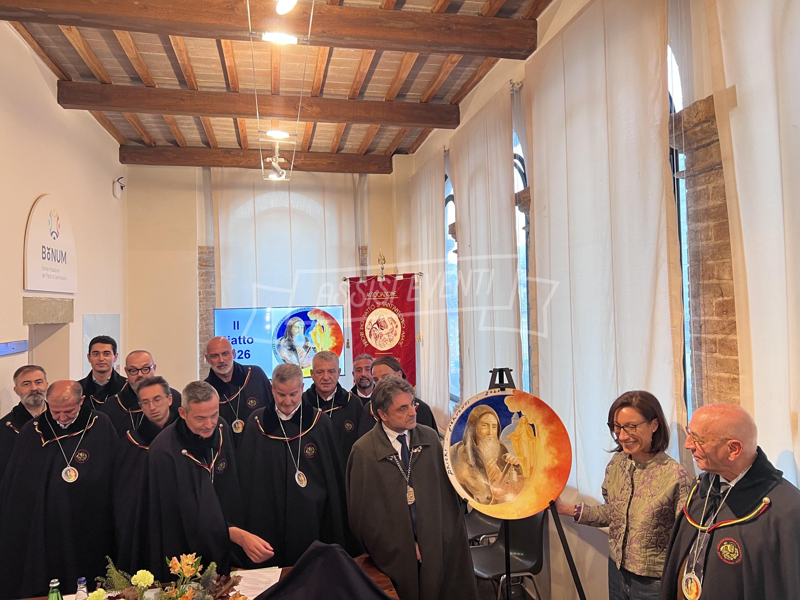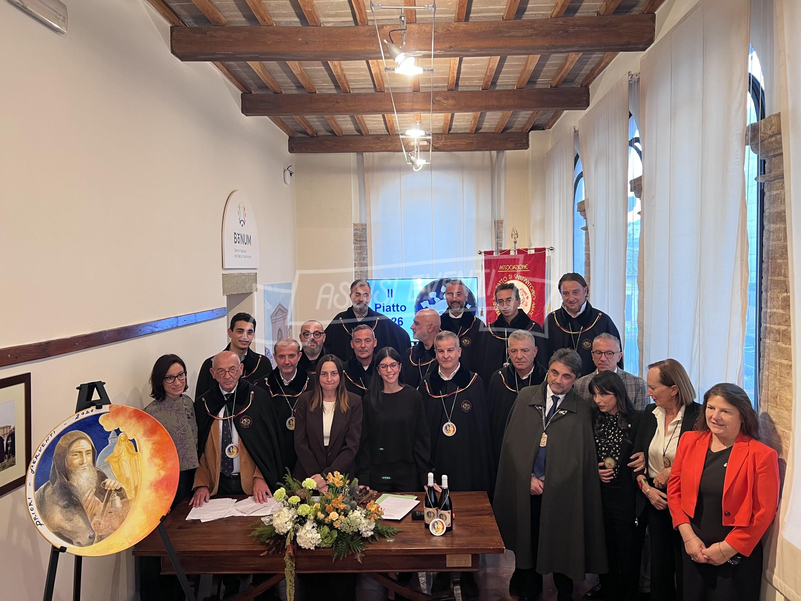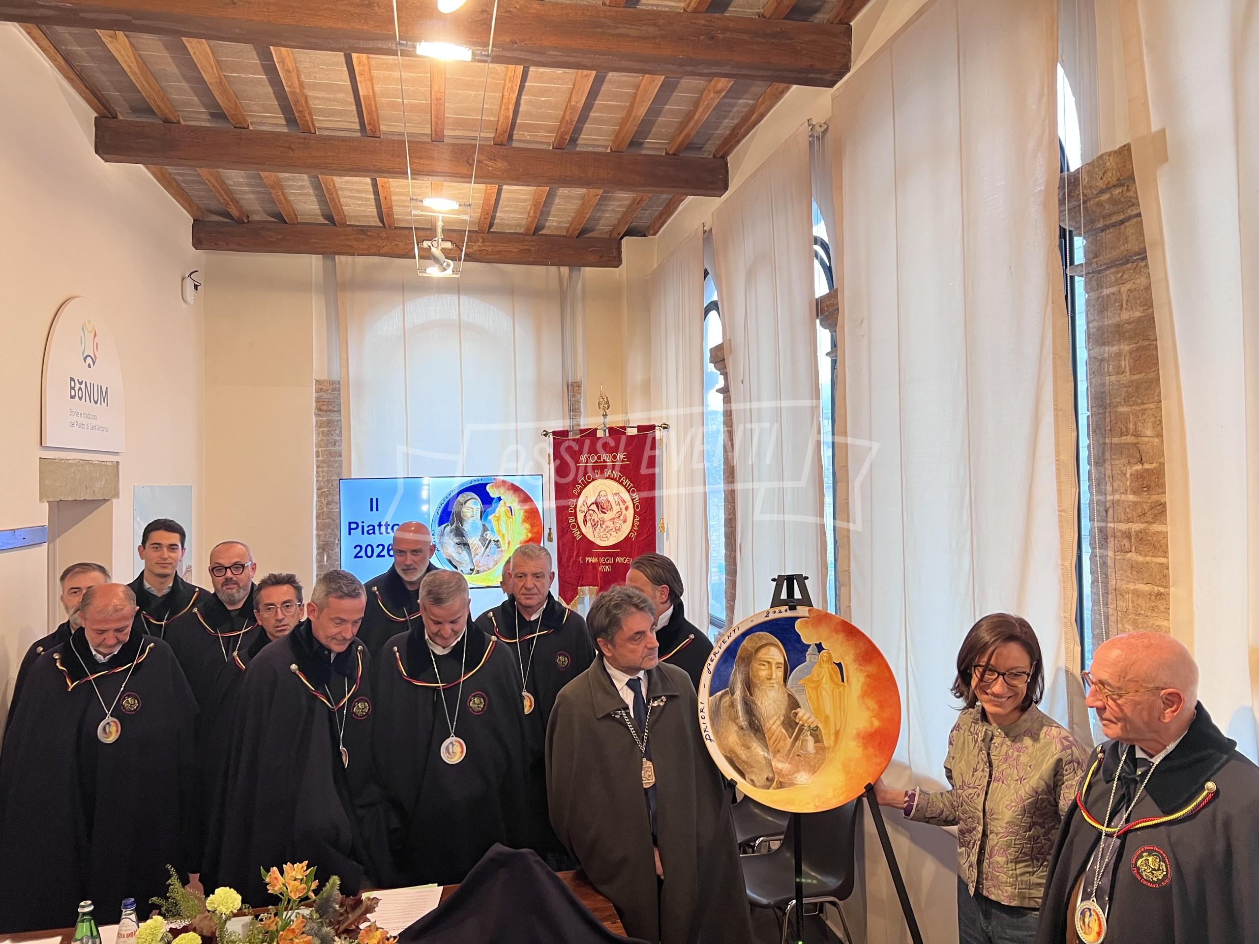 Pomeriggio di festa con i cittadini e le istituzioni, sabato 18 ottobre 2025, presso il Palazzo del Capitano del Perdono a Santa Maria degli Angeli, dove ha preso il via ufficialmente la Festa del Piatto di Sant’Antonio Abate 2026. All’ordine del giorno la presentazione dei Priori Serventi 2026 e i segni rappresentativi del Piatto. Un cerimoniale molto atteso dall’intera comunità angelana, alla presenza della Presidente della Regione, Stefania Proietti, della vicesindaco di Assisi Veronica Cavallucci, dell’assessora Scilla Cavanna, del parroco di Santa Maria degli Angeli, padre Saul Tambini, del neopresidente dell’associazione Priori Piatto di Sant’Antonio Abate, Pietro Ronca, dei rappresentanti di autorità civili e militari.