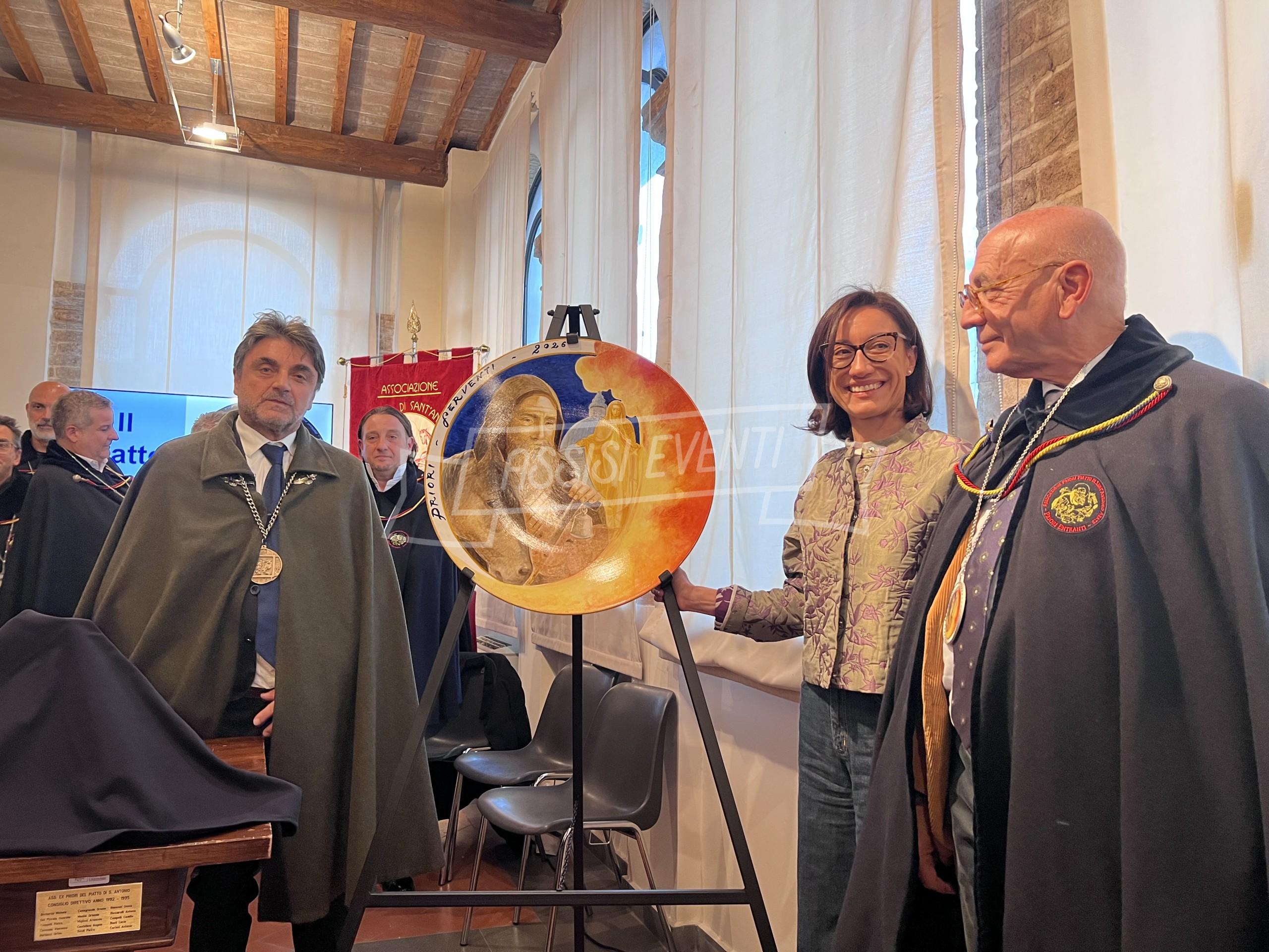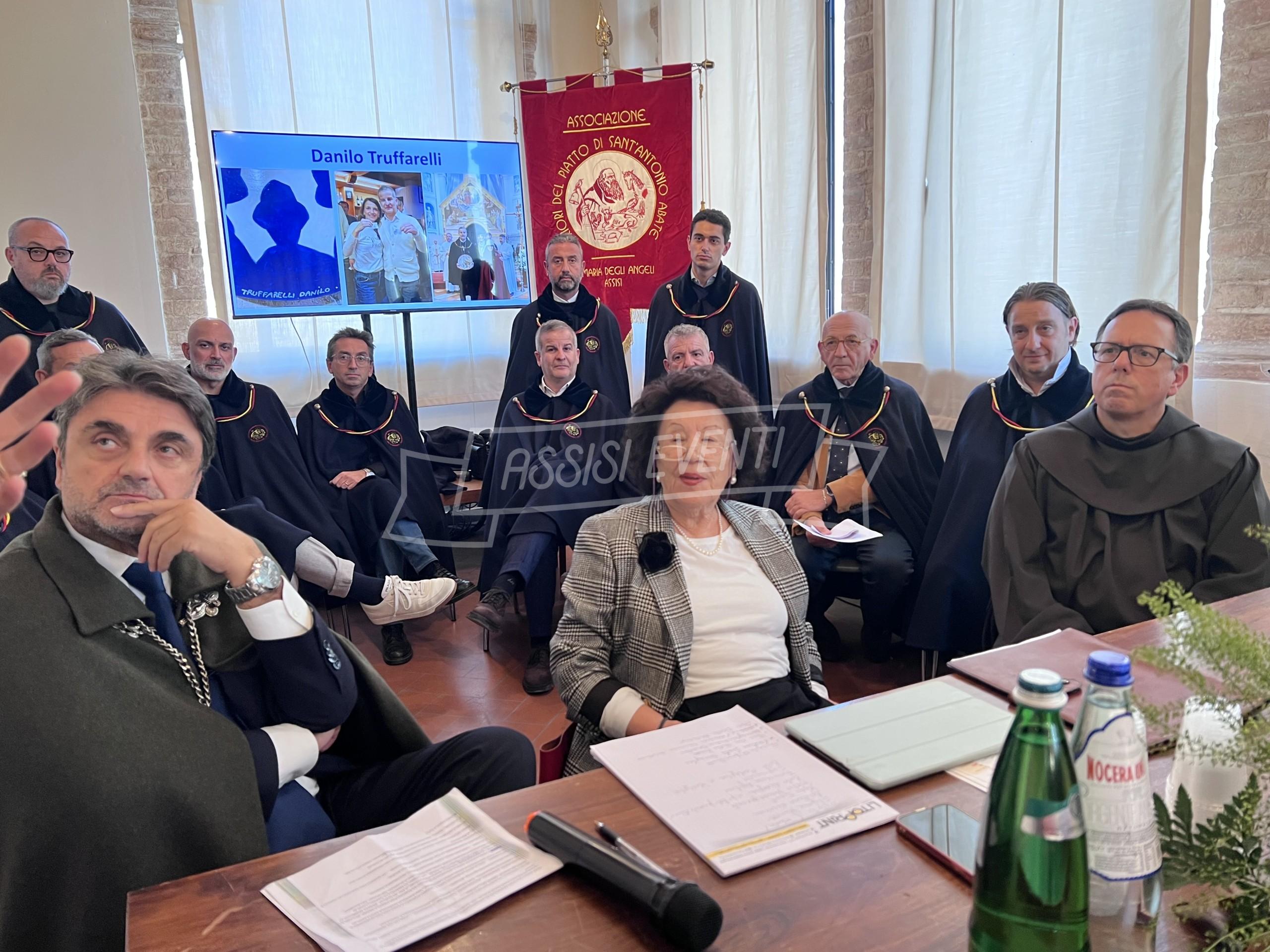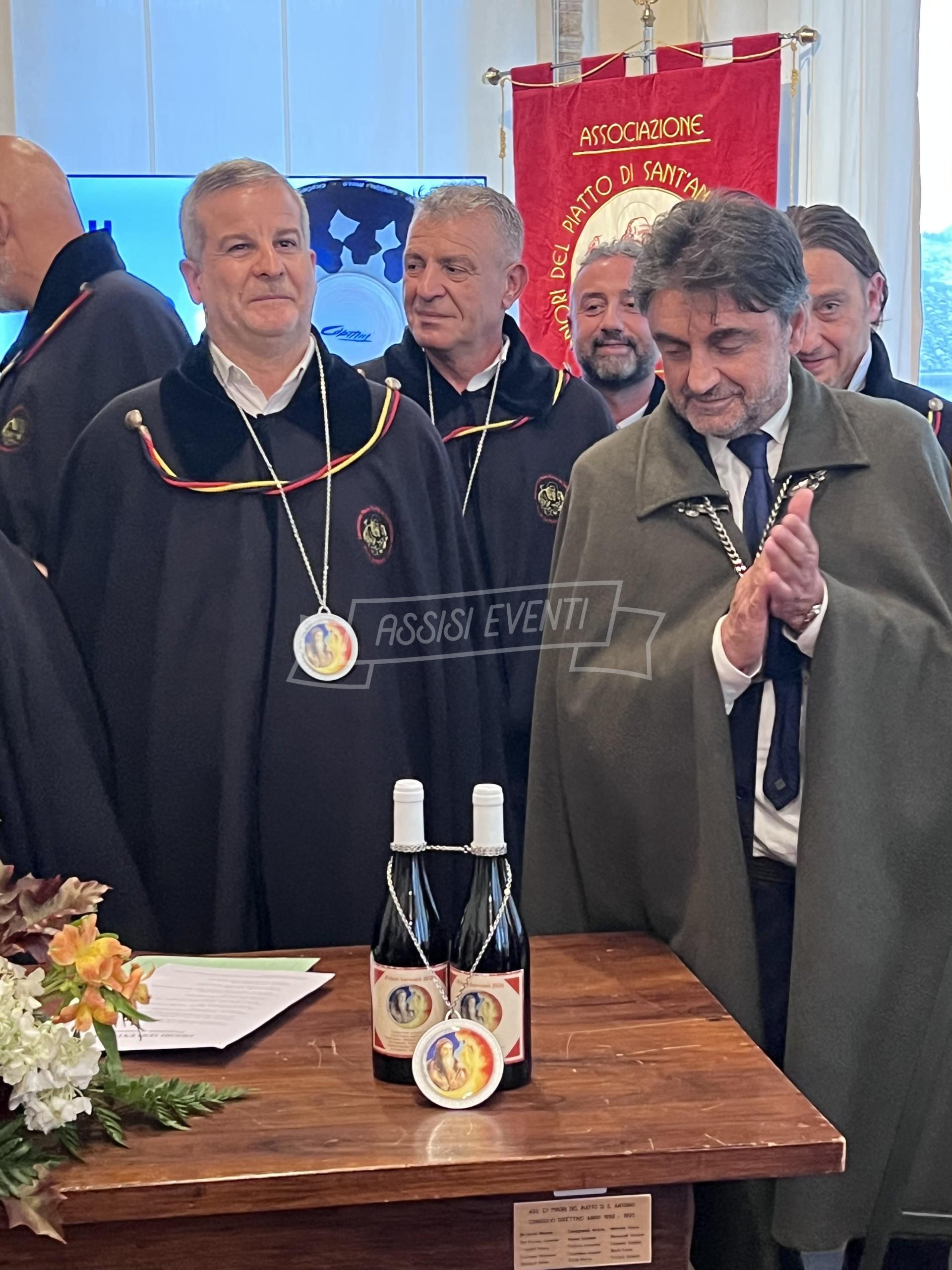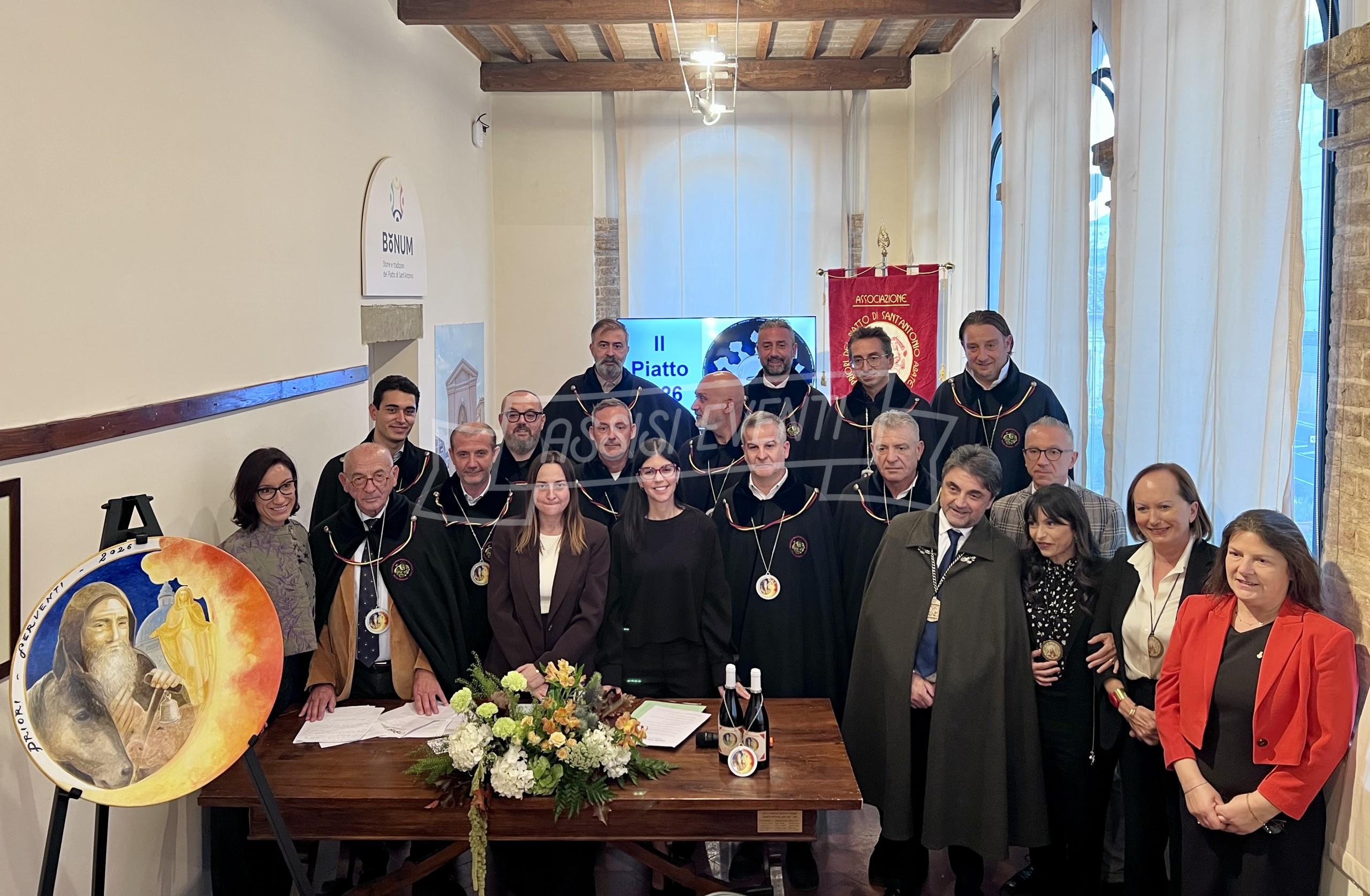 Pomeriggio di festa con i cittadini e le istituzioni, sabato 18 ottobre 2025, presso il Palazzo del Capitano del Perdono a Santa Maria degli Angeli, dove ha preso il via ufficialmente la Festa del Piatto di Sant’Antonio Abate 2026. All’ordine del giorno la presentazione dei Priori Serventi 2026 e i segni rappresentativi del Piatto. Un cerimoniale molto atteso dall’intera comunità angelana, alla presenza della Presidente della Regione, Stefania Proietti, della vicesindaco di Assisi Veronica Cavallucci, dell’assessora Scilla Cavanna, del parroco di Santa Maria degli Angeli, padre Saul Tambini, del neopresidente dell’associazione Priori Piatto di Sant’Antonio Abate, Pietro Ronca, dei rappresentanti di autorità civili e militari.