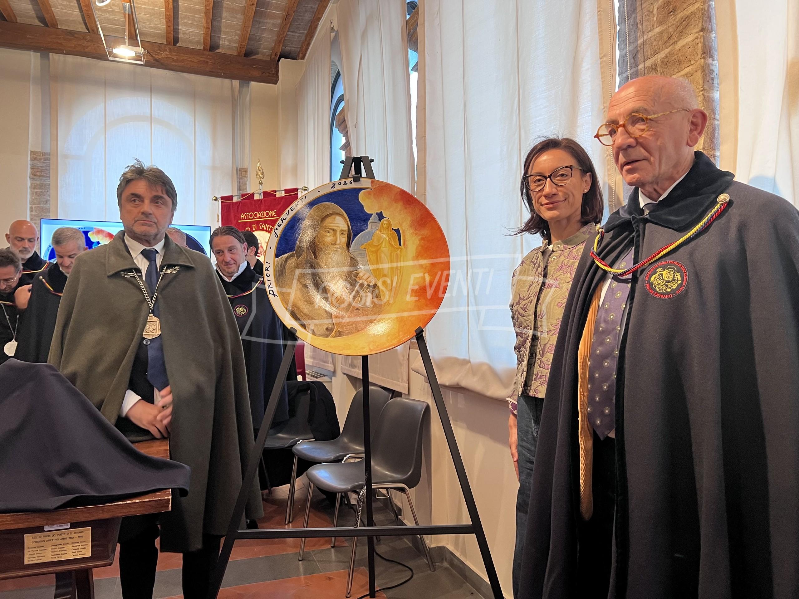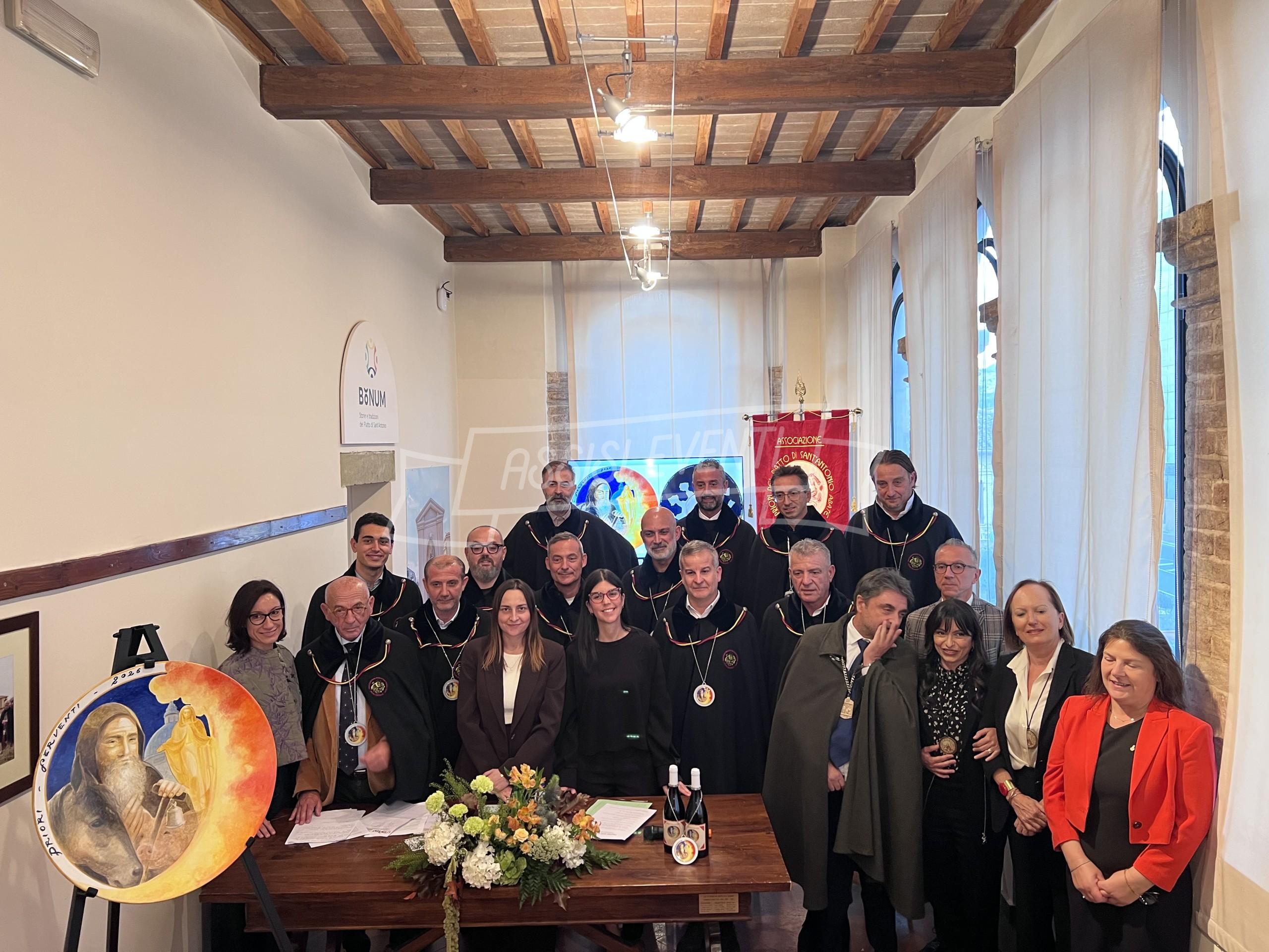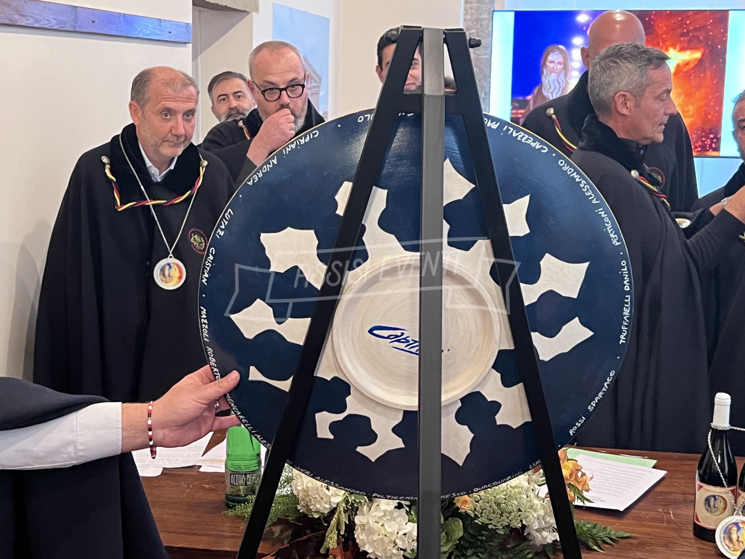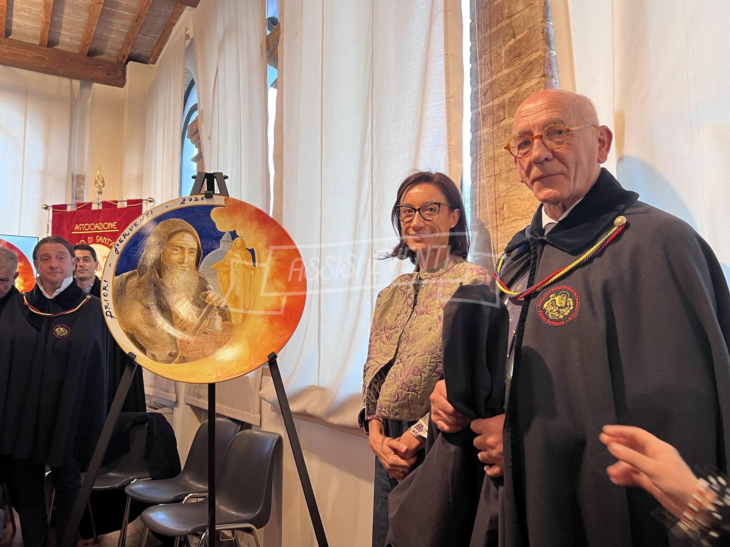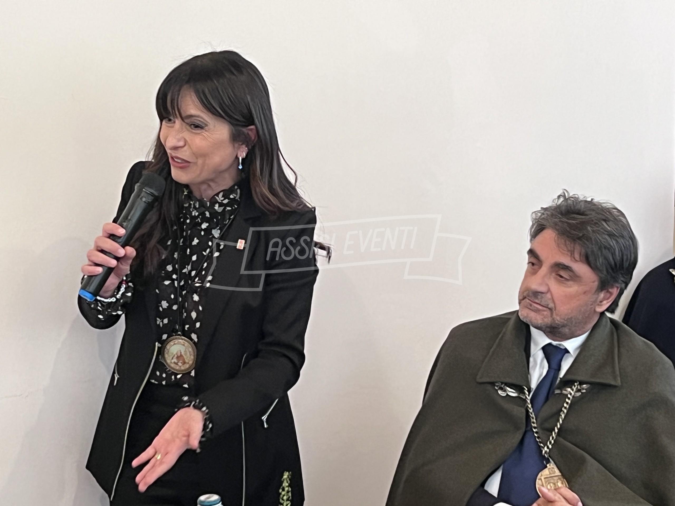 Pomeriggio di festa con i cittadini e le istituzioni, sabato 18 ottobre 2025, presso il Palazzo del Capitano del Perdono a Santa Maria degli Angeli, dove ha preso il via ufficialmente la Festa del Piatto di Sant’Antonio Abate 2026. All’ordine del giorno la presentazione dei Priori Serventi 2026 e i segni rappresentativi del Piatto. Un cerimoniale molto atteso dall’intera comunità angelana, alla presenza della Presidente della Regione, Stefania Proietti, della vicesindaco di Assisi Veronica Cavallucci, dell’assessora Scilla Cavanna, del parroco di Santa Maria degli Angeli, padre Saul Tambini, del neopresidente dell’associazione Priori Piatto di Sant’Antonio Abate, Pietro Ronca, dei rappresentanti di autorità civili e militari.