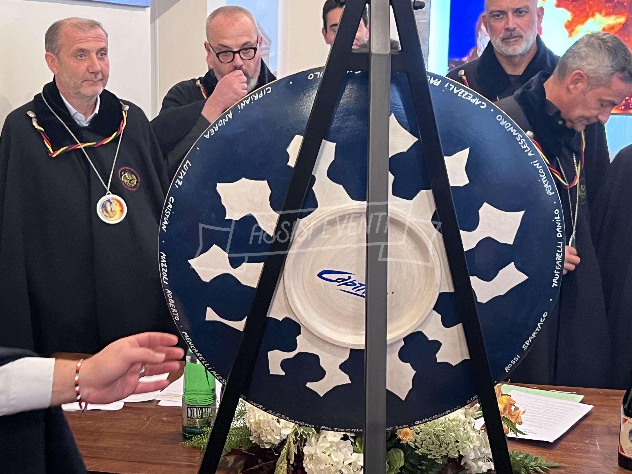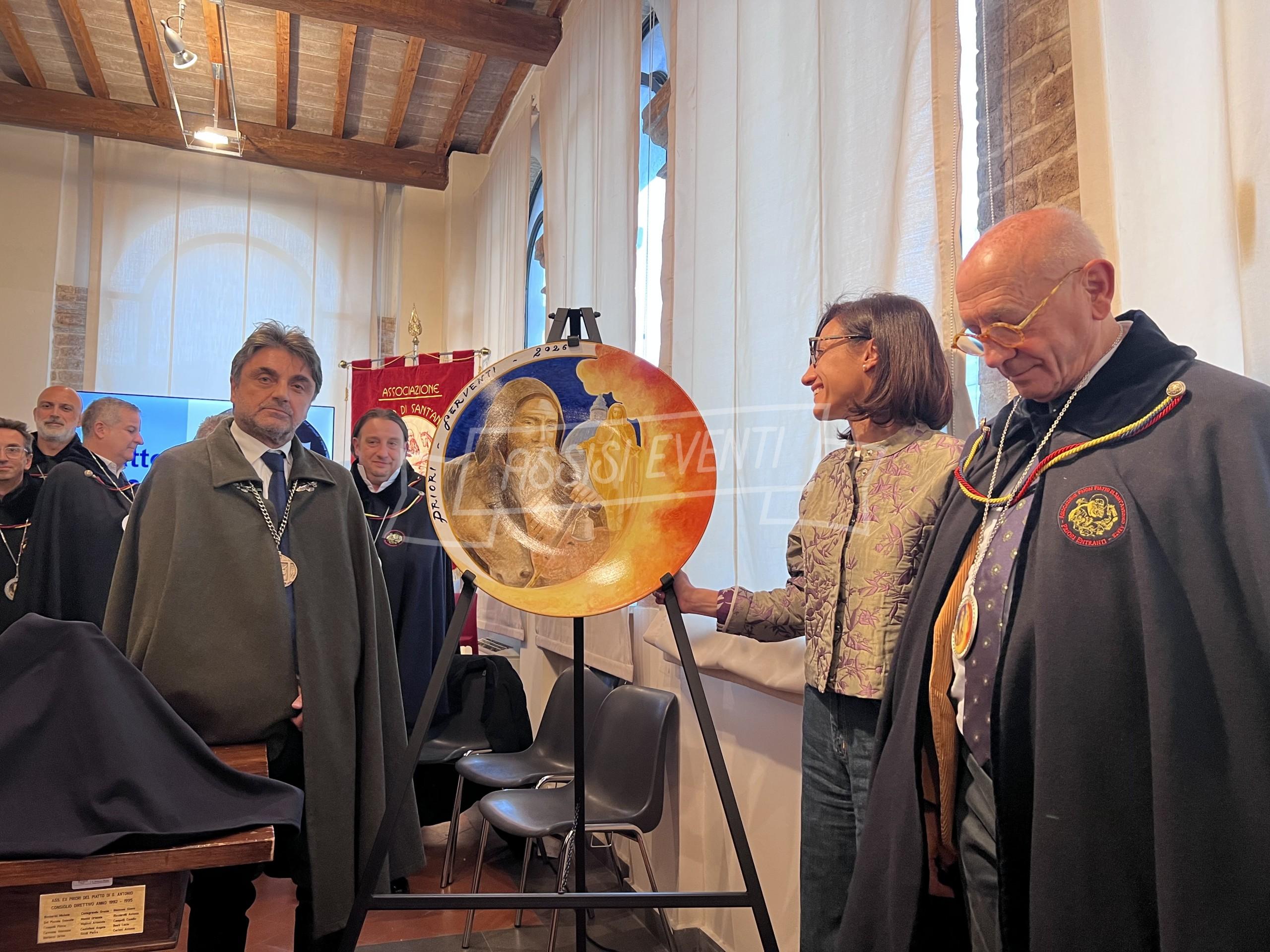 Il momento dello scoprimento del piatto in ceramica è stato emozionante. L’artista Francesca Capitini ha spiegato i motivi ispiratori della sua creazione: il focaraccio del 17 gennaio 2025 sulla piazza spingeva luci e ombre dal Palazzo del Capitano del Perdono fino alla Basilica e questa atmosfera aveva ispirato priori e artista. Il Piatto infatti raffigura un rassicurante Sant’Antonio con i suoi simbolici animali, nella luce di un notturno cielo blu, scenario della cupola e della Madonnina dorata. Una luna di fuoco riscalda questi segni immortali di Santa Maria. Ma Francesca non ha tralasciato nemmeno il retro del Piatto dove, in cerchio, ci sono i Priori che creano una figura senza inizio né fine, come la loro amicizia, come il servizio nel loro anno di Prioranza.