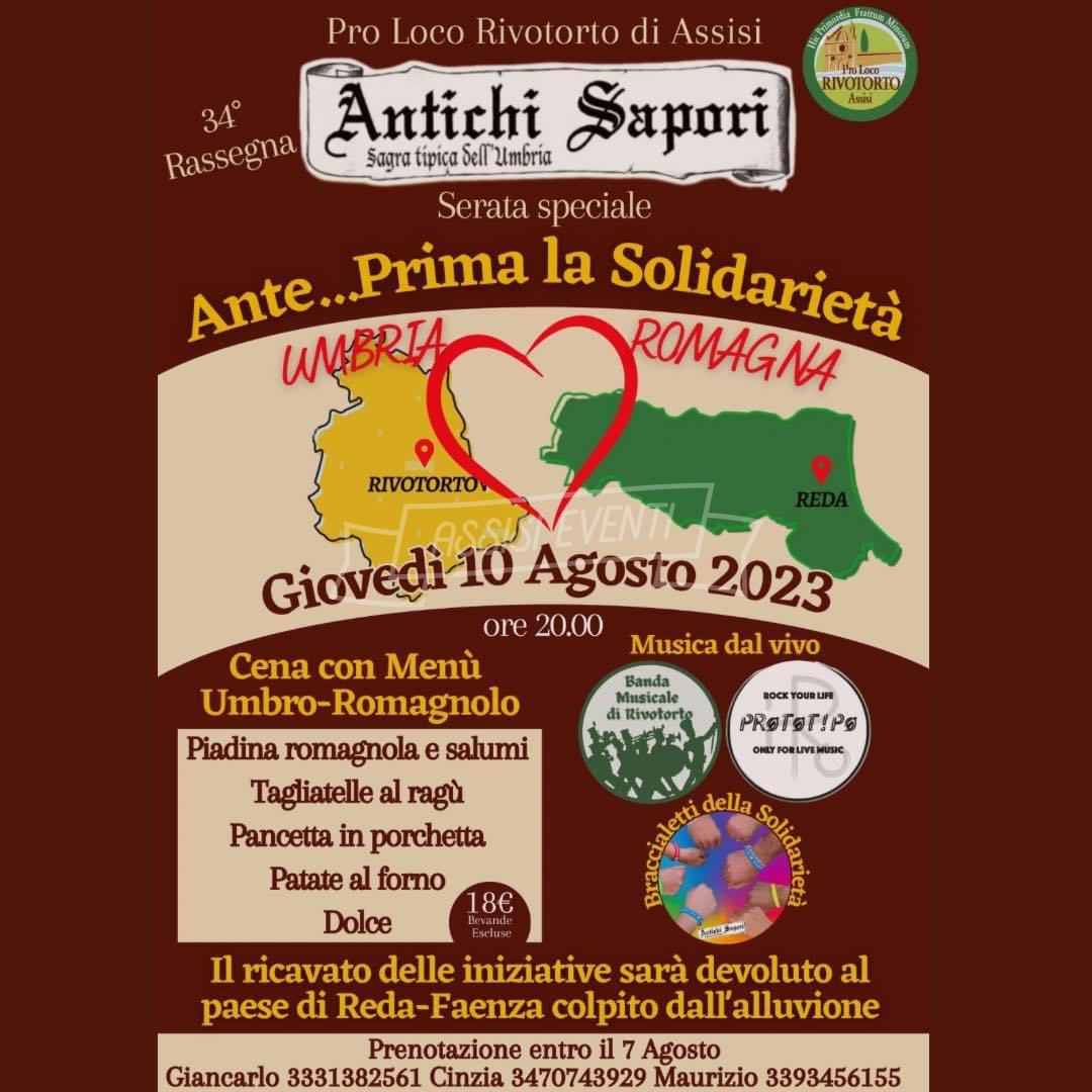 Giovedì 10 agosto 2023, proprio alla vigilia dell’inizio della festa paesana che parte venerdì 11, dalle ore 20.00, l’evento con i proventi a favore della cittadina romagnola di Reda-Faenza. Musica dal vivo, cena con menù umbro-romagnolo, e la presenza della Banda di Rivotorto.