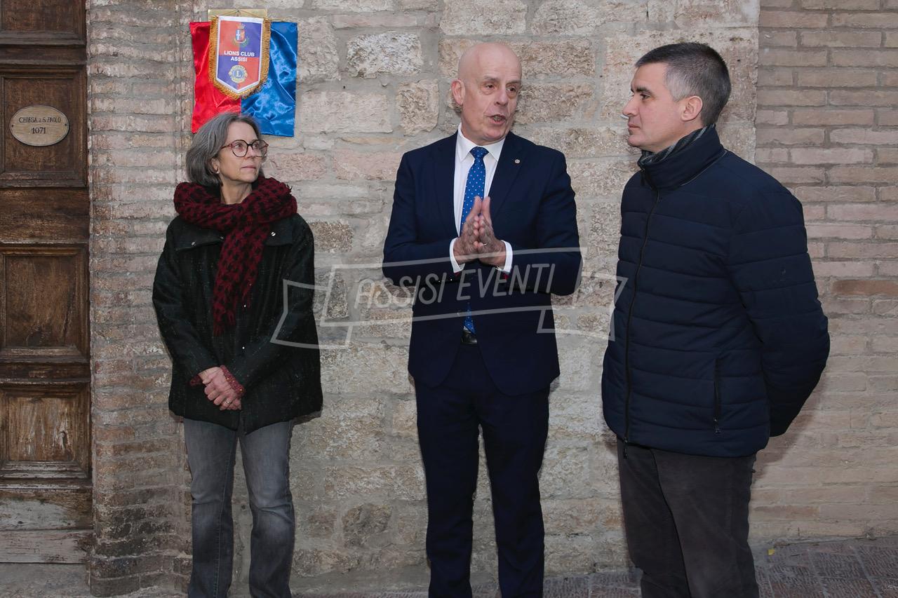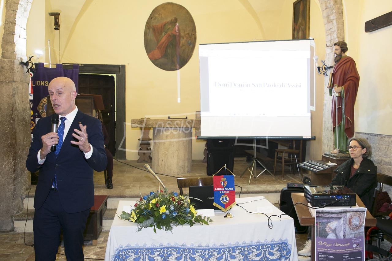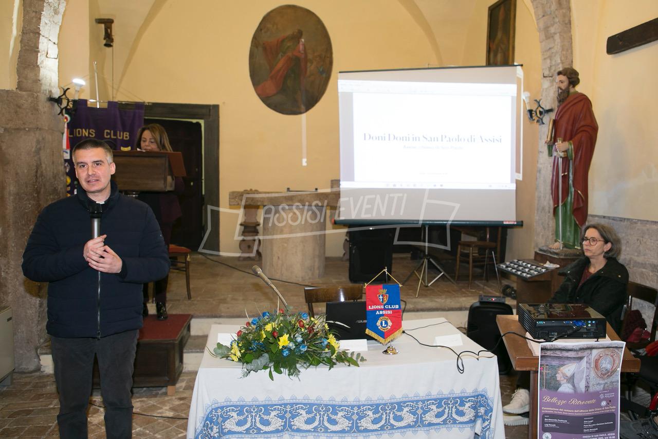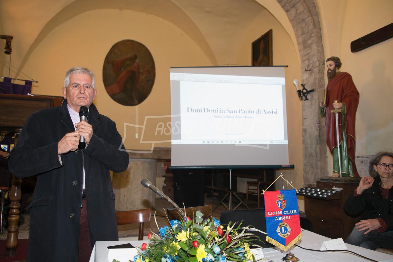 “Sabato sera in San Paolo ad Assisi, presentazione del restauro di un affresco posto sopra l’ingresso. Esistono le favole? Eccome se esistono, una è questa qui. È la fiaba di un’immagine vecchia di secoli, ma soprattutto danneggiata da una grondaia che perde acqua sopra l’affresco. La bottegaia del negozio di fronte lo dice al parroco di San Rufino e a Francesca tuttofare per i beni culturali della diocesi. Francesca lo dice a Christiane e Francesca, che fanno un primo intervento di messa in sicurezza. Non basta: Francesca è golosa e lo dice a Claudio mentre mangiano una peschina al bar di Vinti a Jangeli. Claudio lo dice ai LIons di Assisi, che ci mettono i soldi. I soldi non bastano e Francesca lo chiede a mamma Banca, che ci mette i soldi che mancano. Si fa il restauro e lo fanno Paolo, Christiane e Francesca. Sembra una favole e invece è vero. In chiesa non c’è un posto libero, e per fortuna mi sono portato la mia carrozzina da casa. Parla don Alessandro e dice grazie a tutti, Parla Luigi Rossetti che dei LIons è il presidente, e dice grazie anche lui. Poi parla Claudio Menichelli, che è quello delle peschine che ha messo a posto tutto. Parlo io come marito della restauratrice. Era proprio necessario? Non voleva lasciarmi solo a casa. Comunque dico che quel malconcio dipinto è di Dono Doni e non me ne ero accorto prima: Dono Doni che fu amico di Giorgio Vasari, che lavorò tanto ma del quale non si sa niente perché stava sempre a spasso, tra Roma e Firenze. Ma soprattutto perché aveva sposato una donna di Perugia e poi una di Foligno, e le chiese di Perugia e di Foligno son tutte cambiate, o hanno messo i quadri in magazzino. Poi parla la mia sposa, e per me resta il perfetto esempio di quanto siano stati bravi gli insegnanti d’italiano della Stranieri di Perugia: quasi quasi mi ci voglio fidanzare. Il tutto avviene sotto lo sguardo di Simonetta Manganelli, che da cerimoniere dei LIons fa la fatina azzurra e dà la parola a questo e a quello. Addirittura Francesco Raspa ha fatto spostare il cavo della luce che pendeva sopra il dipinto appena restaurato: come a dire, prima l’acqua e poi la luce? Tra nemmeno un mese sarà Natale, il primo regalo è già arrivato. Miracolo delle peschine di Vinti!”.