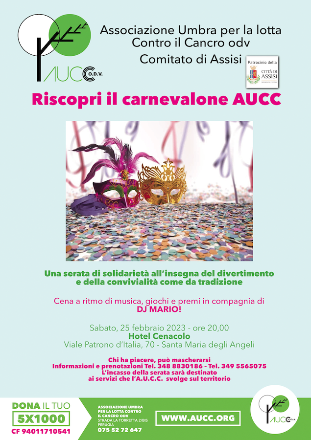 “Riscopri il Carnevalone A.U.C.C.” è il tema dell’evento organizzato dall’associazione umbra per la Lotta contro il Cancro Comitato di Assisi, in programmazione il 25 febbraio 2023 all’Hotel Cenacolo di Santa Maria degli Angeli, una serata di solidarietà all’insegna del divertimento e della convivialità secondo la tradizione. Si è da poco insidiato il nuovo Consiglio Direttivo, che ha definito, insieme a tutti i volontari, un ricco programma di eventi per sostenere tutti i servizi che l’associazione offre ai pazienti oncologici.