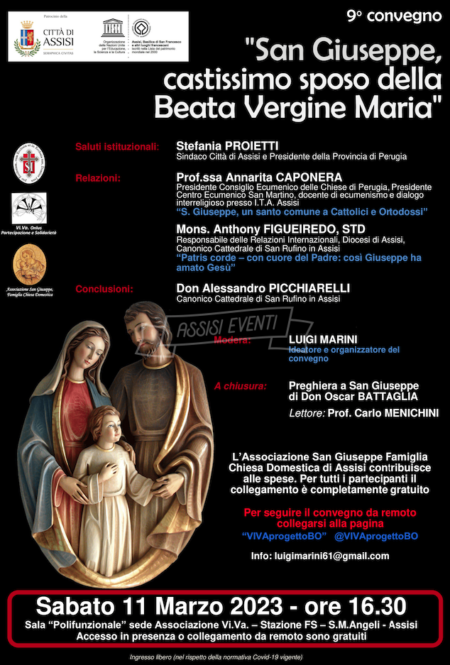 Sabato 11 marzo alle ore 16.30 presso la Sala “Polifunzionale” dell’Associazione Vi.Va. Partecipazione e Solidarietà APS – ETS (P.zza Dante Alighieri – Stazione FS – Santa Maria Degli Angeli) si svolgerà il 9° convegno su “San Giuseppe, castissimo sposo della Beata Vergine Maria”, appuntamento annuale ideato e voluto da Luigi Marini che ha raggiunto la nona tappa. Iniziativa molto apprezzata dal pubblico presente negli incontri precedenti.