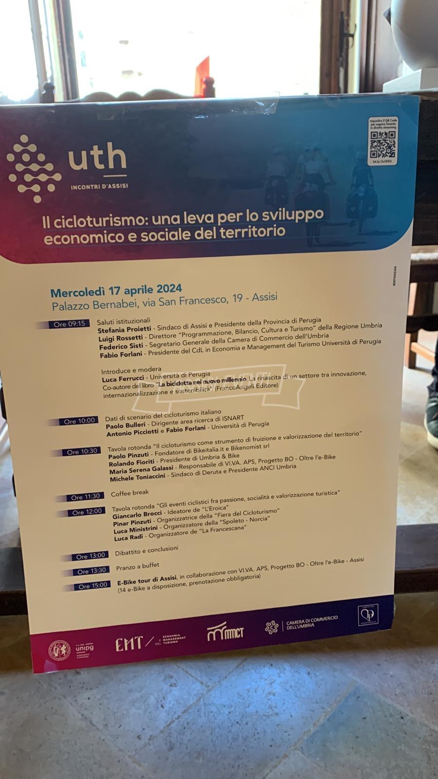 In mattinata i saluti istituzionali moderati da Luca Ferrucci dell’Università di Perugia, co-autore del libro “La bicicletta nel nuovo millennio. La rinascita di un settore tra innovazione, internazionalizzazione e sostenibilità” (FrancoAngeli Editore). Intervenuti Stefania Proietti sindaco di Assisi e Presidente della Provincia di Perugia, Luigi Rossetti direttore “Programmazione, Bilancio, Cultura e Turismo” della Regione Umbria, Federico Sisti segretario Generale della Camera di Commercio dell’Umbria, Fabio Forlani presidente del CdL in Economia e Management del Turismo Università di Perugia. A seguire si è parlato dei dati di scenario del cicloturismo italiano, con Paolo Bulleri – Dirigente area ricerca di ISNART, Antonio Picciotti e Fabio Forlani – Università di Perugia, Rolando Fioriti – Presidente di Umbria & Bike.