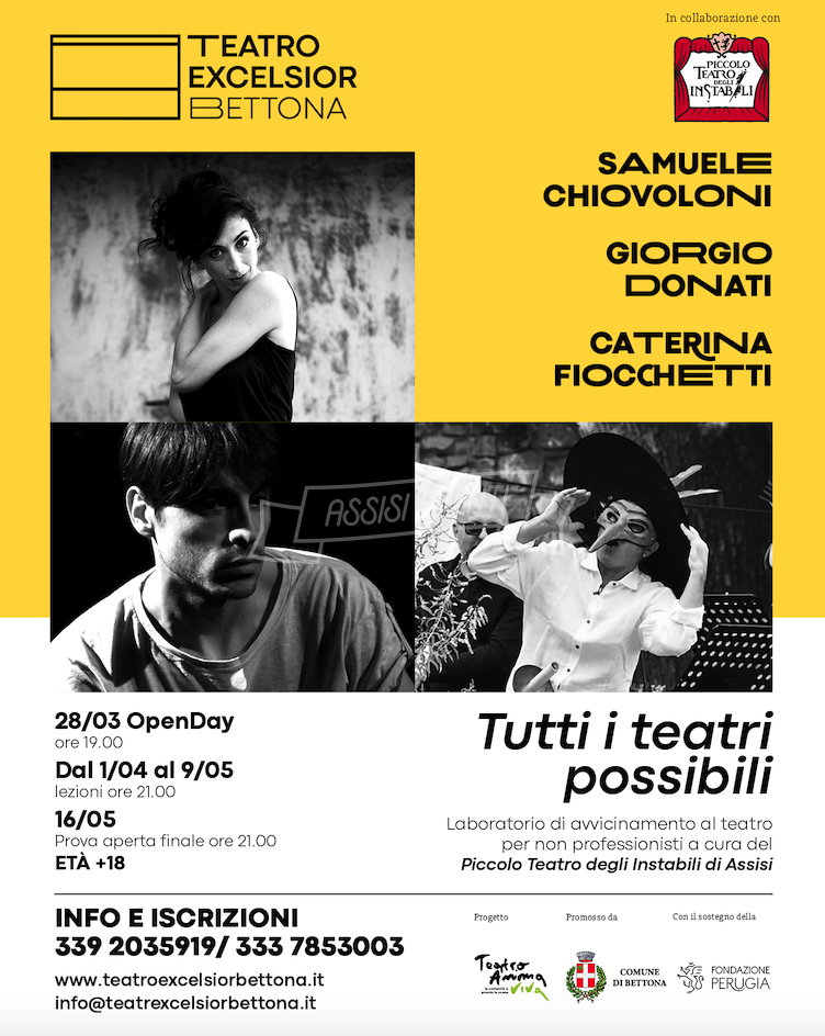 La forza di un progetto sta nell’ambizione di proporre idee, metodi e ipotesi innovativi, tali da creare un precedente e diventare un modello ripetibile anche da altri. È quello che il progetto Teatro Anima Viva del Teatro Excelsior di Bettona cerca di fare con “Tutti i Teatri possibili”, il laboratorio teatrale che partirà il 4 Aprile. Infatti, nella ferma convinzione che il Teatro sia l’arte dell’immaginario e del possibile, si è scelto di costruire una collaborazione tra il Teatro Excelsior Bettona e Il Piccolo Teatro degli Instabili di Assisi. Il primo riparte con la determinazione di costruire percorsi che durino nel tempo e avvicinino le persone, dall’altra una realtà consolidata sul territorio con una grande esperienza di formazione e laboratori. Un tandem ideale che ha portato a definire un corso aperto a tutti, che si svolgerà al Teatro Excelsior Bettona, con due appuntamenti al Piccolo Teatro degli Instabili ad Assisi.