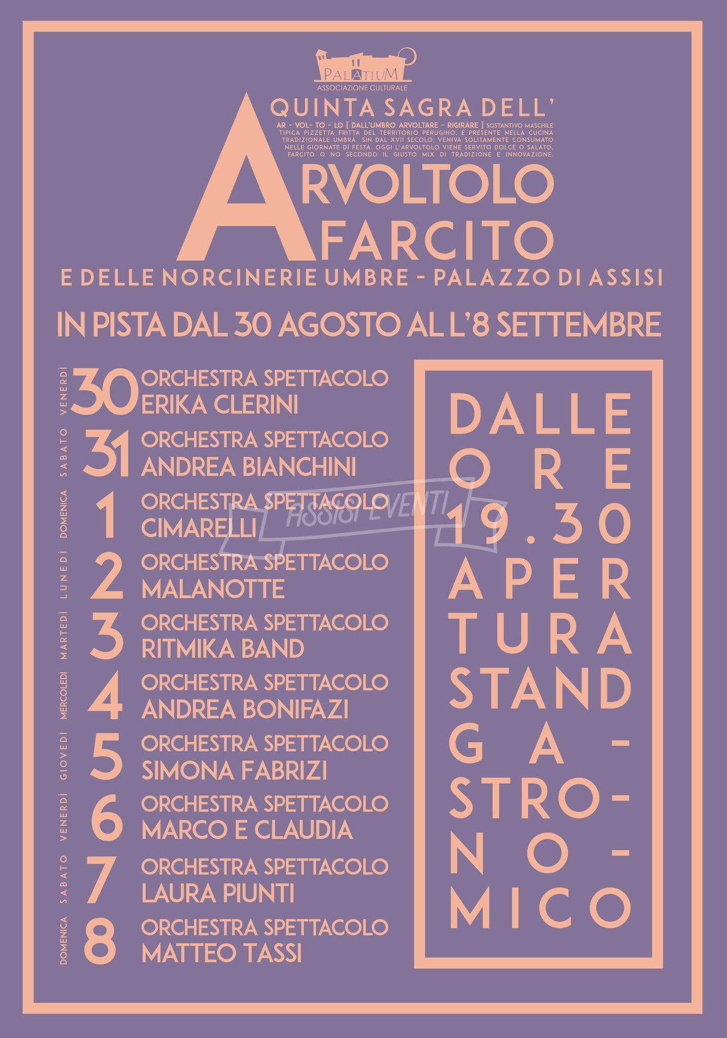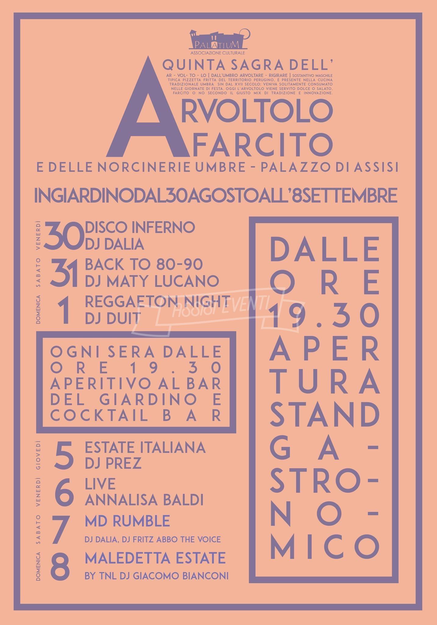 Dal 30 agosto all’8 settembre, oltre agli arvoltoli, antipasti, primi, torte al testo, tante prelibatezze. La manifestazione si terrà presso i giardini pubblici “Ostilio Capezzali” di Palazzo di Assisi con lo stand gastronomico che aprirà tutti i giorni alle ore 19:30. Ogni sera sarà aperto il cocktail bar. Oltre al buon cibo, ci sarà anche buona musica con l’esibizione delle migliori orchestre e, come detto, A-PUB.