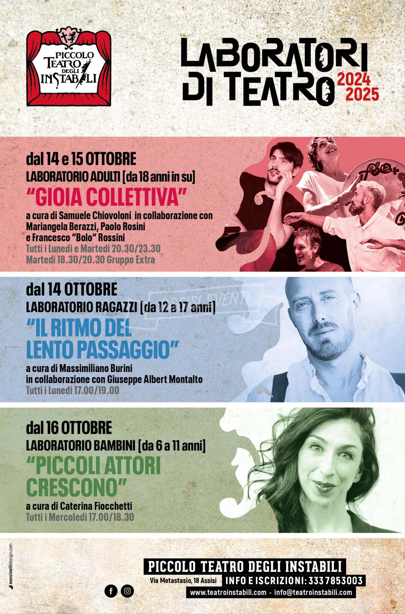 Il 14 e 15 ottobre avrà inizio anche il nuovo Laboratorio dedicato agli Adulti da 18 anni in su, condotto da Samuele Chiovoloni(autore e regista) in collaborazione con Mariangela Berazzi(cantante e attrice), Francesco Bolo Rossini (attore e regista) e Paolo Rosini (danzatore e performer). Il Laboratorio, che registra ogni anno il sold out di iscrizioni, si svolge tutti i lunedì/martedì dalle 20:30 alle 23:30 e a partire da quest’anno, il martedì verrà istituito un terzo “gruppo extra” dalle 18:30 alle 20:30. “Gioia collettiva” è il titolo di questo Laboratorio di espressione, comunicazione e immaginazione teatrale da perseguire con tutti i mezzi possibili: danza, canto, parola, poesia, immaginario, pensiero, desiderio. Una comunità creatrice che lavora intensamente rispettando la fragilità e incentivando il coraggio, offrendo supporto alla ricerca di ognuno dei partecipanti.