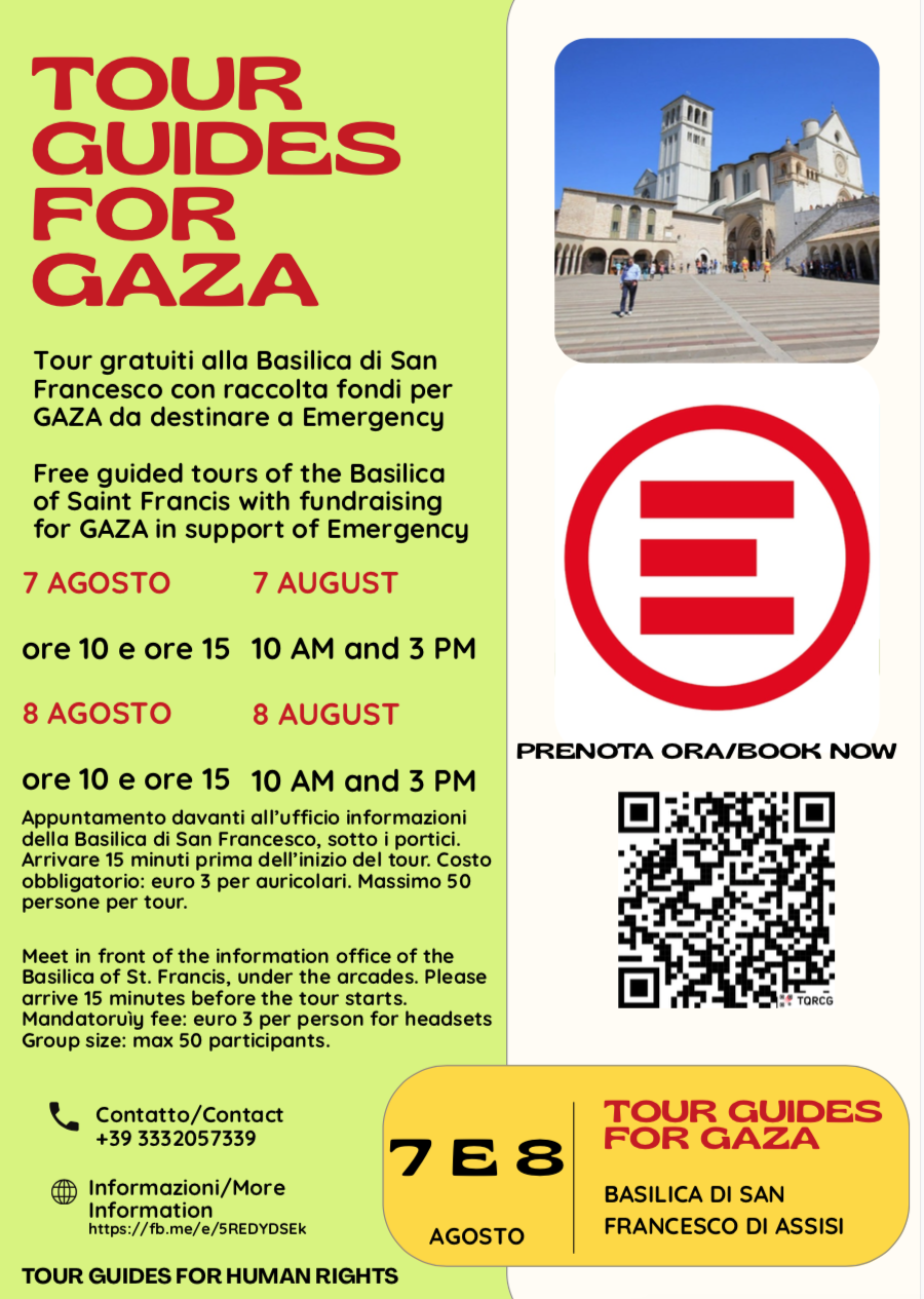 Ad Assisi arriva una iniziativa organizzata da un gruppo di guide turistiche indipendenti dell’Umbria, che svolgeranno, come volontarie, turni di visite guidate per raccogliere fondi per Gaza da destinare ai progetti sanitari di Emergency sul campo. Le visite guidate gratuite si svolgeranno i giorni 7 e 8 agosto, in italiano e in inglese, alla basilica di San Francesco in Assisi. “Abbiamo ottenuto il beneplacito dei frati del Sacro Convento, a disposizione per supportarci nell’accoglienza dei partecipanti. Saranno presenti rappresentanti di Emergency per fornire informazioni e rispondere a tutte le eventuali domande sulla situazione attuale nei territori occupati” – dicono gli organizzatori.