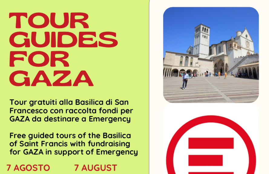 Ad Assisi arriva una iniziativa organizzata da un gruppo di guide turistiche indipendenti dell’Umbria, che svolgeranno, come volontarie, turni di visite guidate per raccogliere fondi per Gaza da destinare ai progetti sanitari di Emergency sul campo. Le visite guidate gratuite si svolgeranno i giorni 7 e 8 agosto, in italiano e in inglese, alla basilica di San Francesco in Assisi. “Abbiamo ottenuto il beneplacito dei frati del Sacro Convento, a disposizione per supportarci nell’accoglienza dei partecipanti. Saranno presenti rappresentanti di Emergency per fornire informazioni e rispondere a tutte le eventuali domande sulla situazione attuale nei territori occupati” – dicono gli organizzatori.