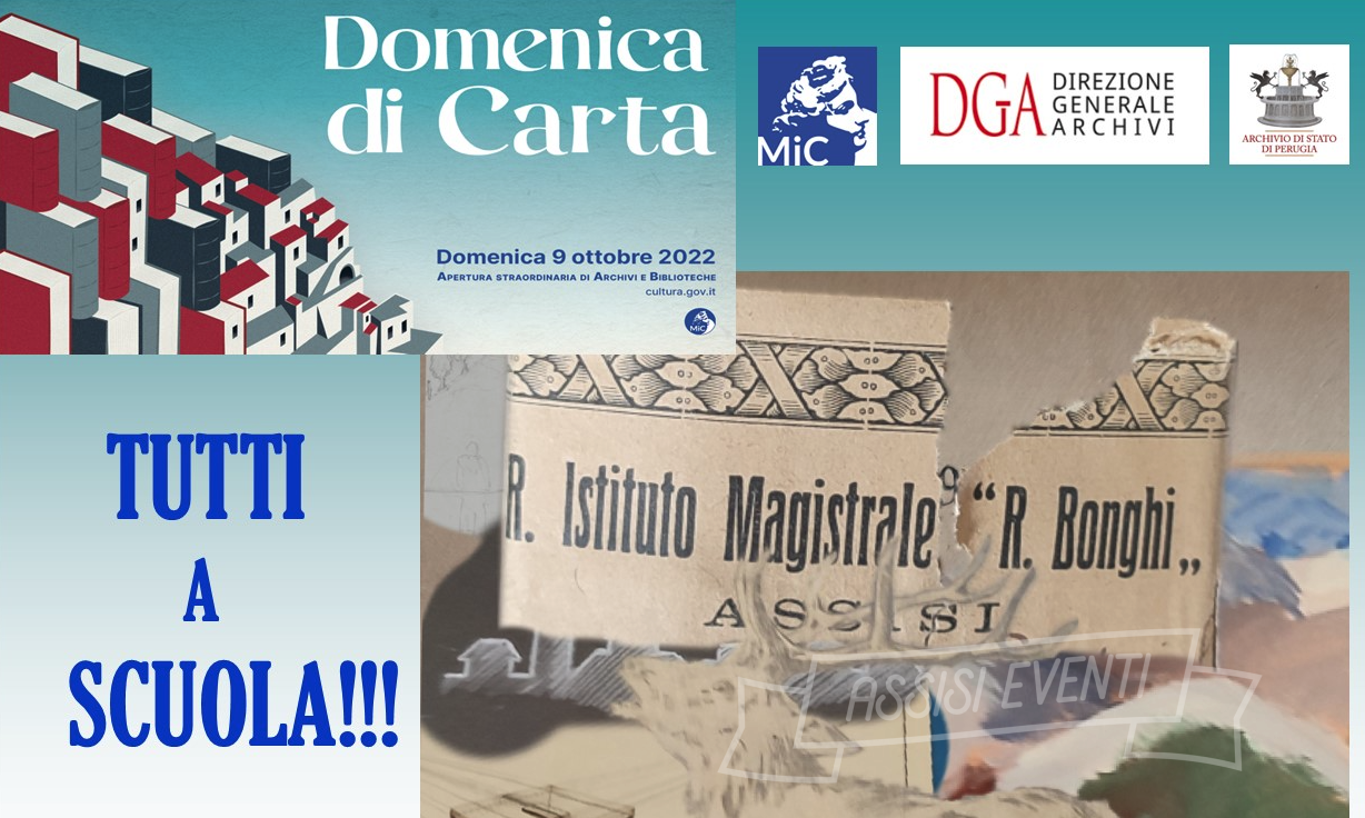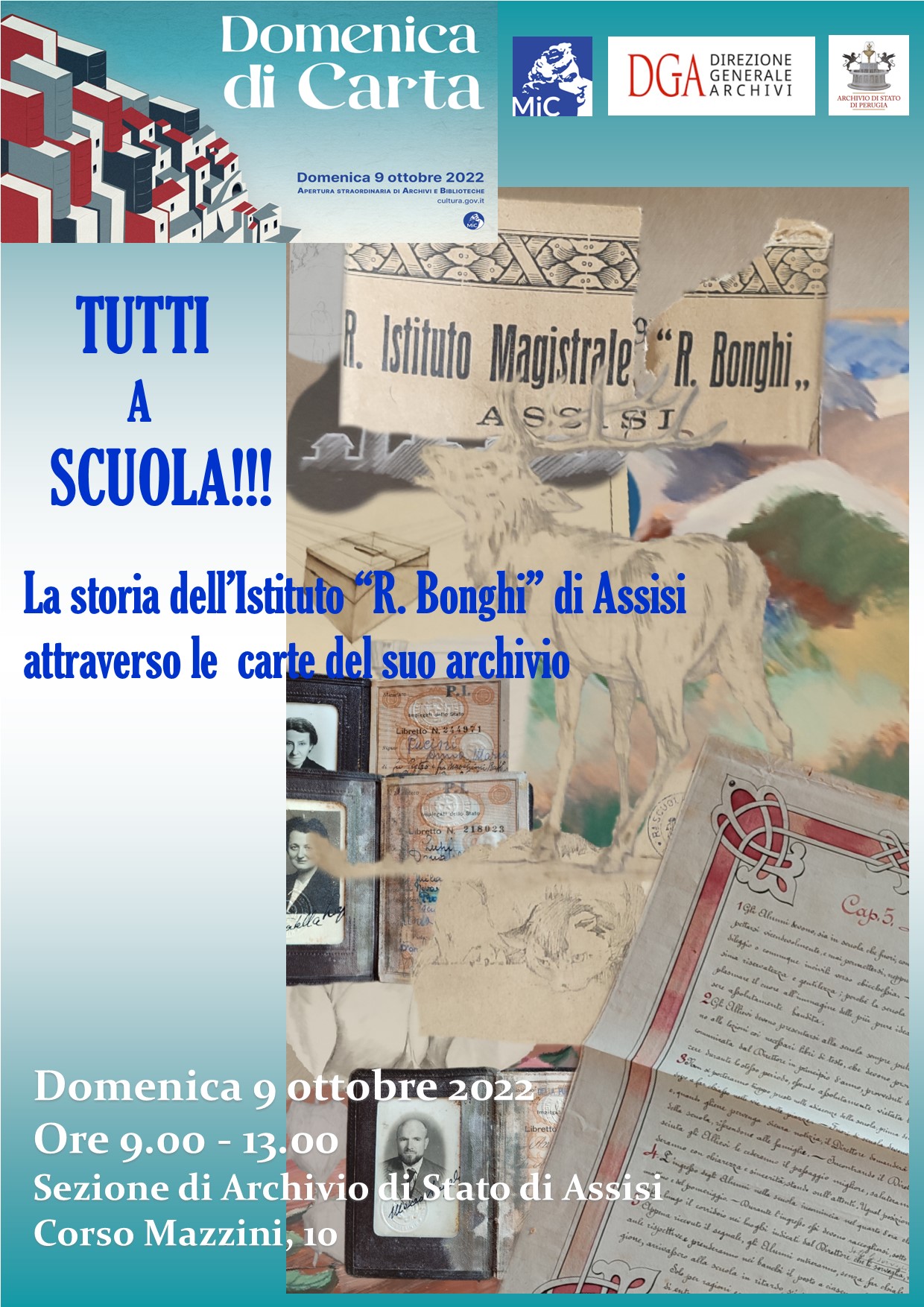 In occasione dell’evento nazionale “Domenica di Carta” del 9 ottobre 2022, presso la Sezione di Archivio di Stato di Assisi, si presenta una mostra documentaria dal titolo “Tutti a scuola!” nella quale si espongono documenti provenienti dall’archivio del soppresso Istituto magistra le R. Bonghi di Assisi. È questo il risultato di un primo intervento effettuato sulle carte del prezioso archivio scolastico che ci permette di ricostruire le articolate vicende di un istituto che ha svolto un ruolo preminente nella vita culturale della città.